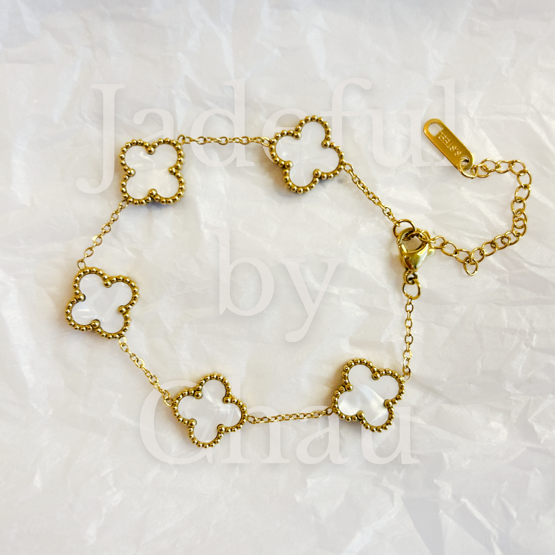 The CLOVER bracelet in mother-of-pearl white This bracelet combines delicate design with high-quality craftsmanship. Made of 18k gold-plated stainless steel, it features five filigree clover pendants with a faux mother-of-pearl finish. The gentle shimmer of the pendants lends the bracelet an elegant touch – subtle yet striking. Thanks to its water-resistant and rustproof quality, this piece of jewelry remains beautiful even with daily wear.