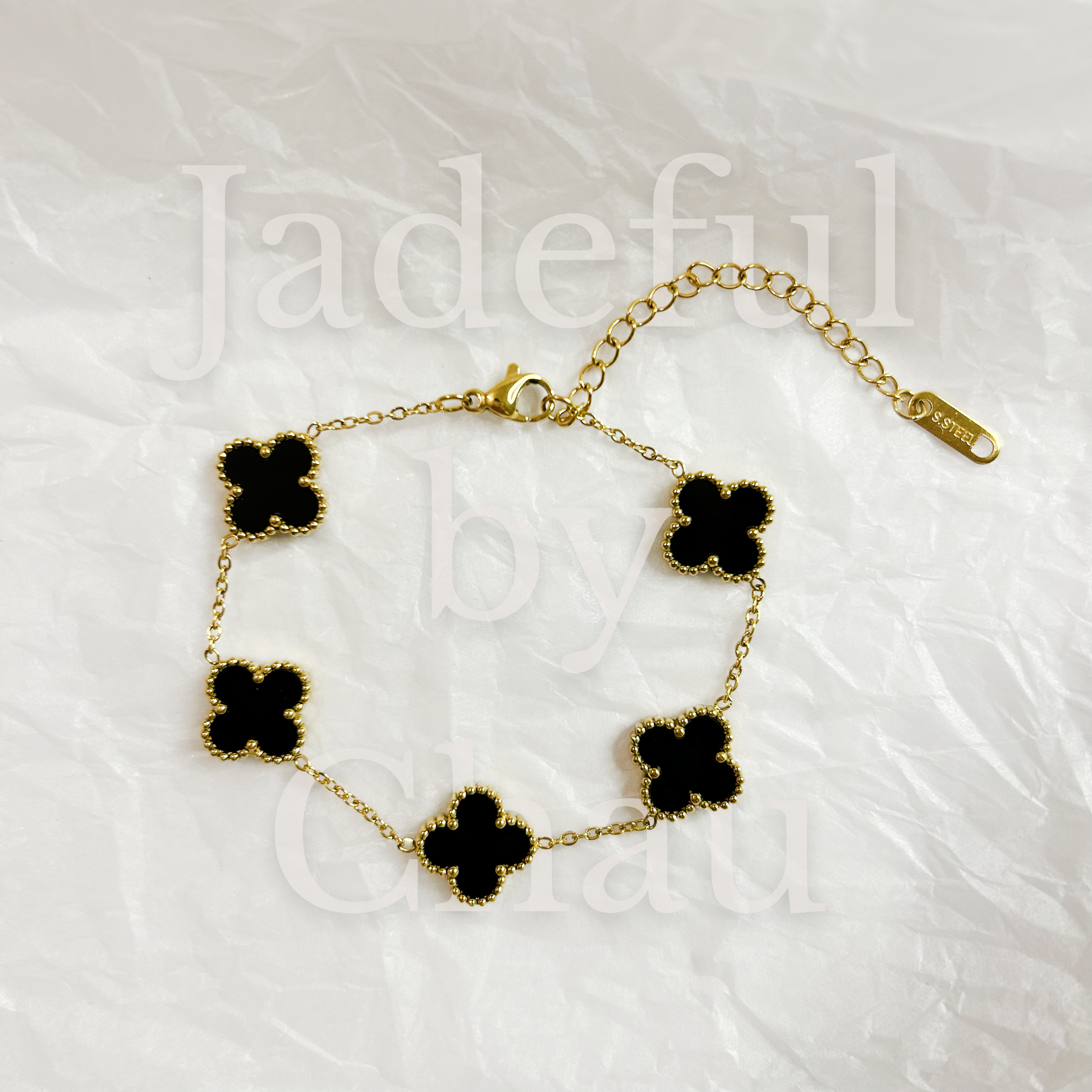 The CLOVER bracelet in black impresses with its elegant, minimalist design in 18k gold-plated stainless steel. Five delicate cloverleaf charms with a deep black, glossy finish give the bracelet a modern yet sophisticated look. Waterproof and rustproof, it will stylishly accompany you through everyday life.
