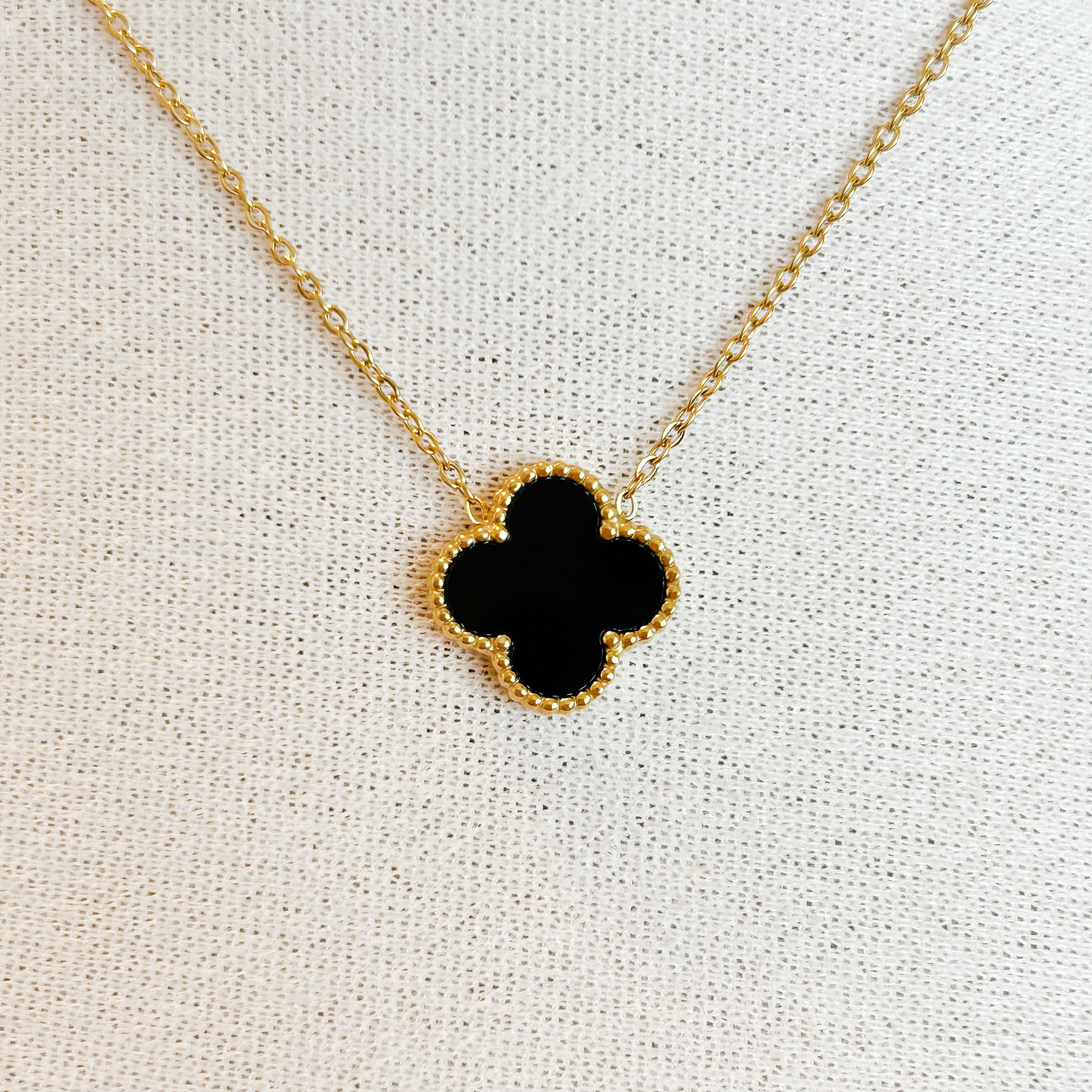 The CLOVER necklace in black combines a modern design with exquisite craftsmanship. Made of 18k gold-plated stainless steel, it features a stylized cloverleaf with a deep black, glossy finish that creates a captivating contrast to the gold-plated piece. The water-resistant and rustproof chain is ideal for everyday wear and retains its flawless shine.