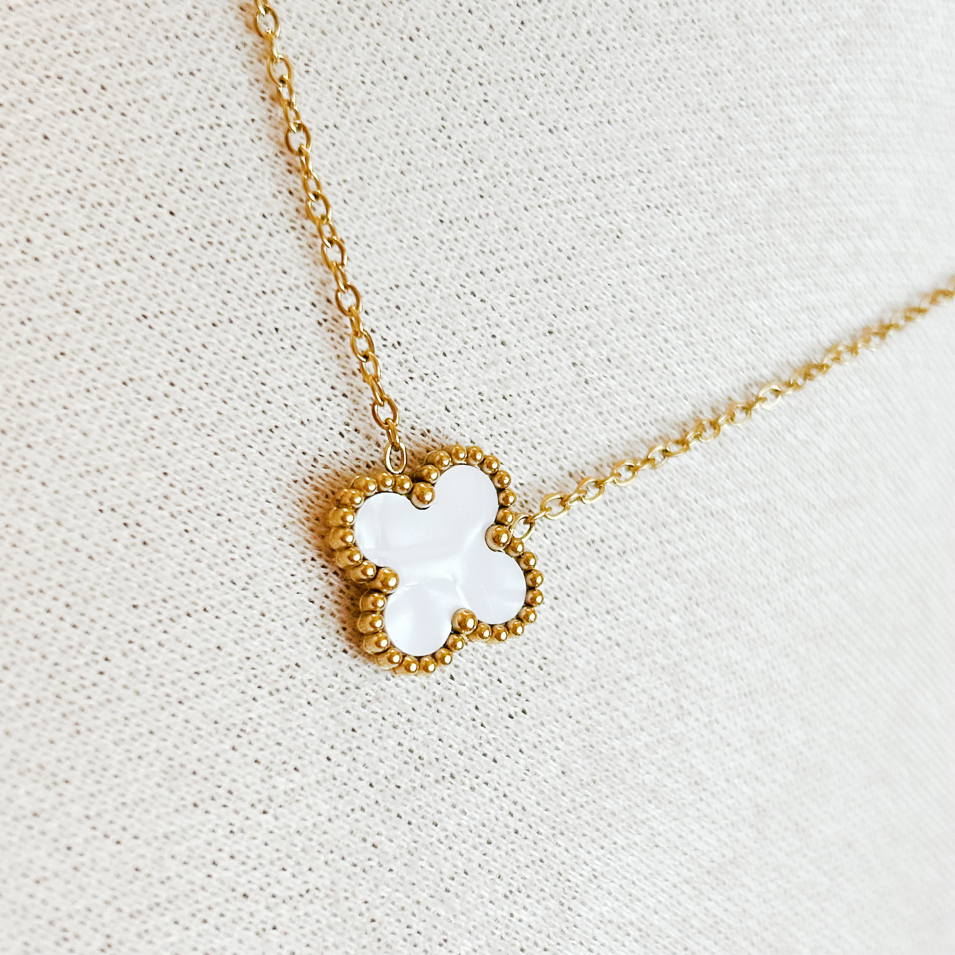 The CLOVER necklace in pearly white combines delicate design with high-quality craftsmanship. Made of 18k gold-plated stainless steel, it features a stylized cloverleaf with a faux mother-of-pearl effect – subtly shimmering yet expressive. The water-resistant and rustproof necklace is perfect for everyday wear and will retain its shine for years to come.