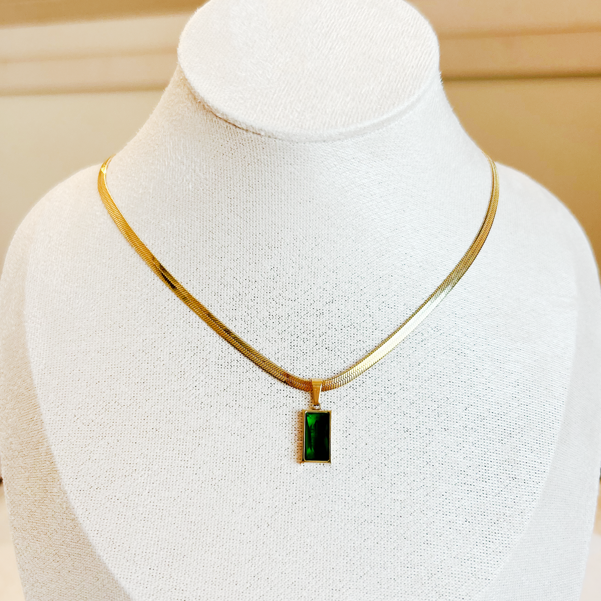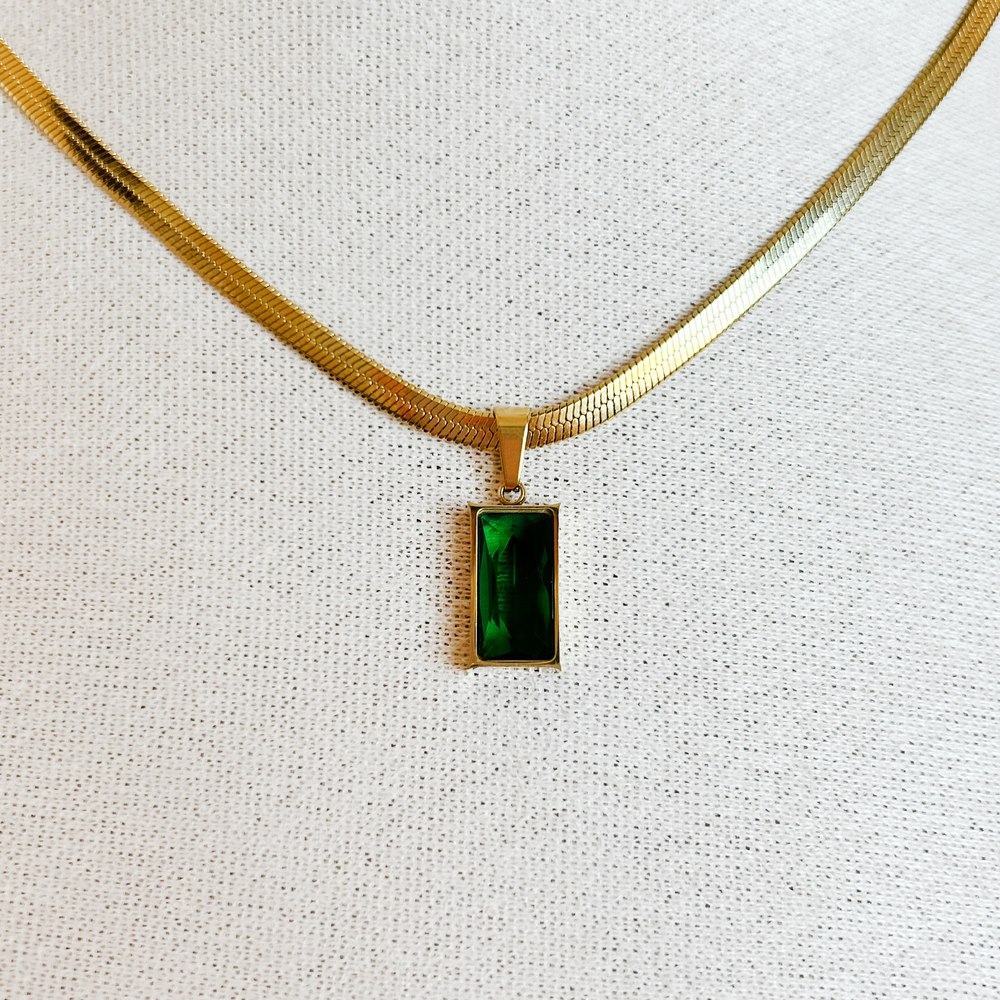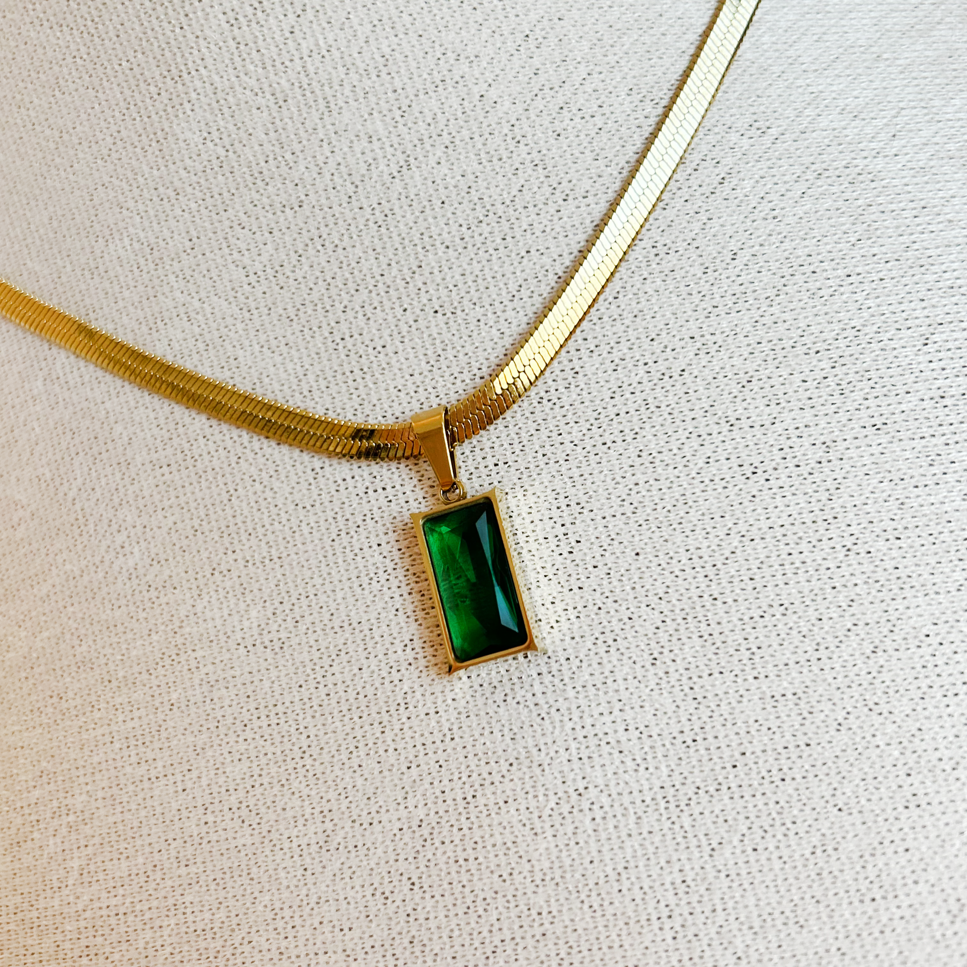 The EMERALD necklace in gold brings a fresh, vibrant touch to your look with its striking rectangular pendant in a luminous green. The acrylic stone is set in a gold-tone setting, complemented by a stylish parallelogram-shaped cutout on the back – a sophisticated detail with instant recognition. The snake chain made of 18k gold-plated stainless steel (galvanized) harmoniously completes the design and provides a gleaming finish.