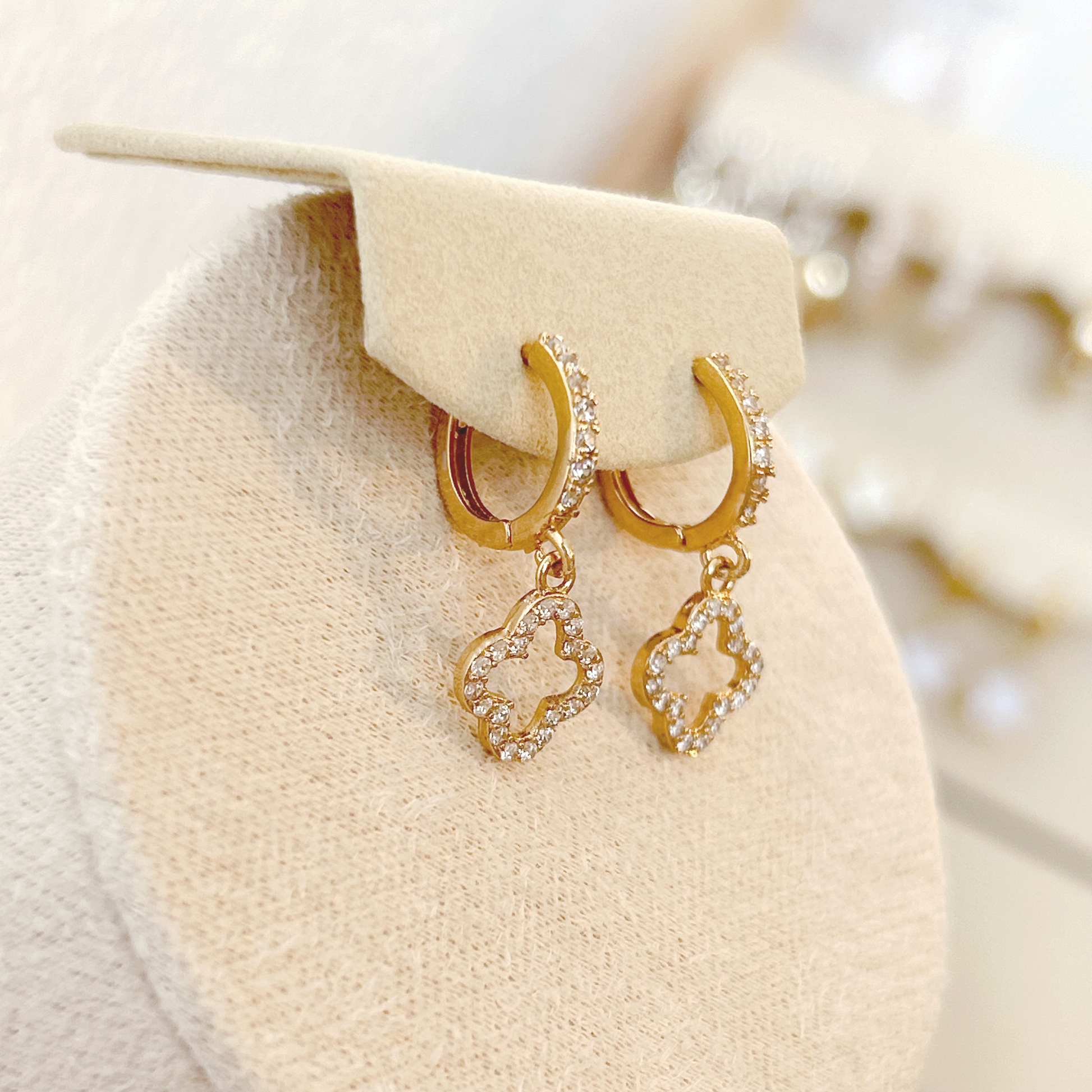 The FORTUNA gold earrings are little talismans for everyday life. A delicate clover-shaped pendant dangles from dainty mini-hoops adorned with sparkling cubic zirconia stones, its entire outline framed by fine cubic zirconia. This double reflection of light – from the hoop and the symbolic motif – gives the earrings a magical, eye-catching radiance. A modern statement for all who believe in luck and style.