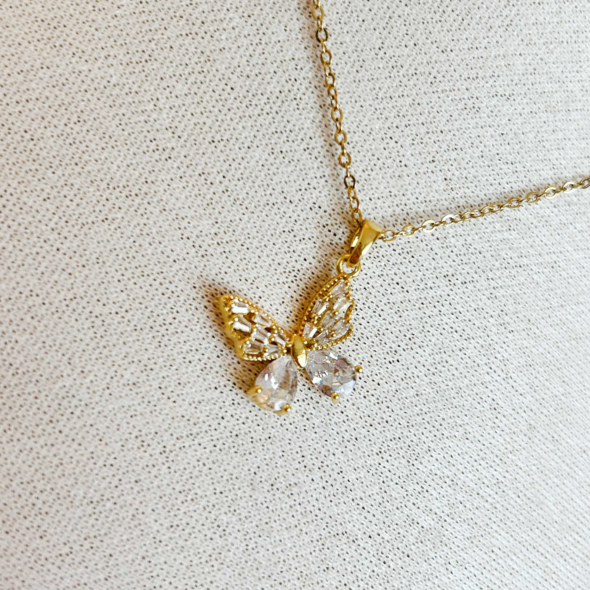 The MONARCH necklace in gold is an homage to the majestic beauty of butterflies. The central pendant captures their graceful form with masterful precision: each lower wing holds an elegant, teardrop-shaped cubic zirconia, while the upper wings are adorned with a dazzling array of tiny cubic zirconia. This combination of clean, bold shapes and a delicate, vibrant luster lends the piece an irresistible, regal aura.