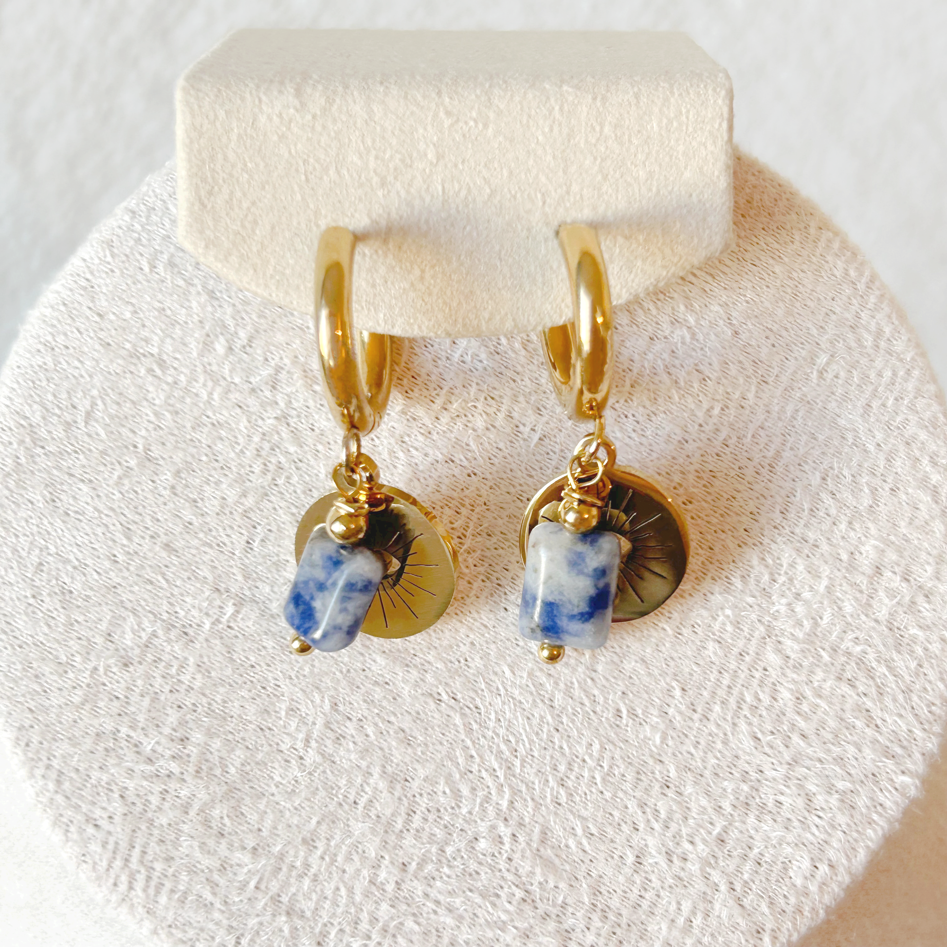 The MYSTIC EYE earrings in gold combine mysterious symbolism with natural sophistication. The round pendant with its cut-out eye design lends the piece a mystical character, while a rectangular pendant of blue jasper provides a striking splash of color. The harmonious blend of gold-plated luster and natural stone grain makes these earrings a distinctive accessory for everyday wear and special occasions.