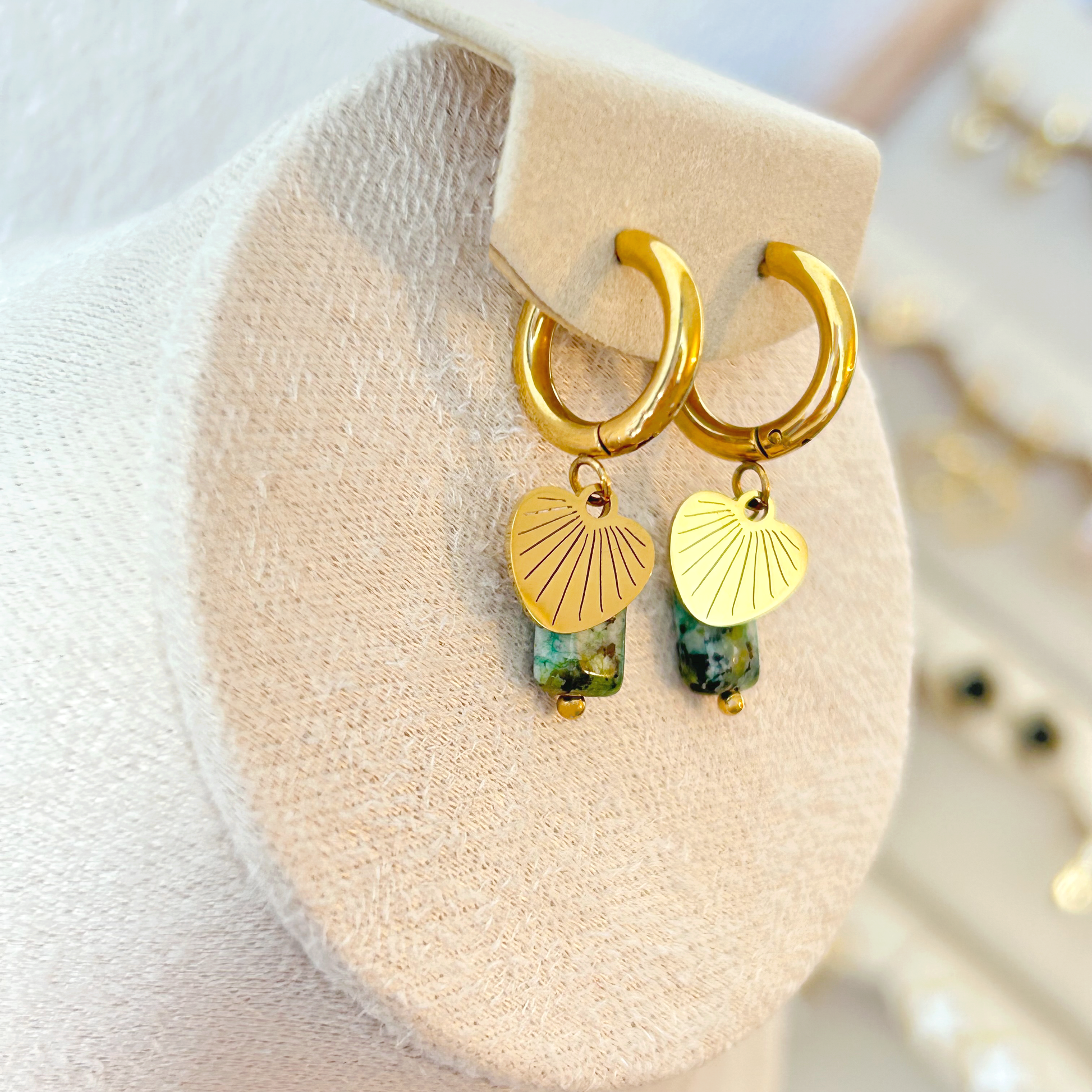 The NATURE earrings in gold combine delicate design with a touch of wild elegance. Each small hoop is adorned with two fine pendants: a delicate gold leaf and a rectangular natural stone. The African turquoise used – a jasper with a characteristic greenish hue and dark, marble-like inclusions – lends the look an organic depth. The asymmetrical combination makes the earrings a real eye-catcher – perfect for those who want to wear natural beauty with style.