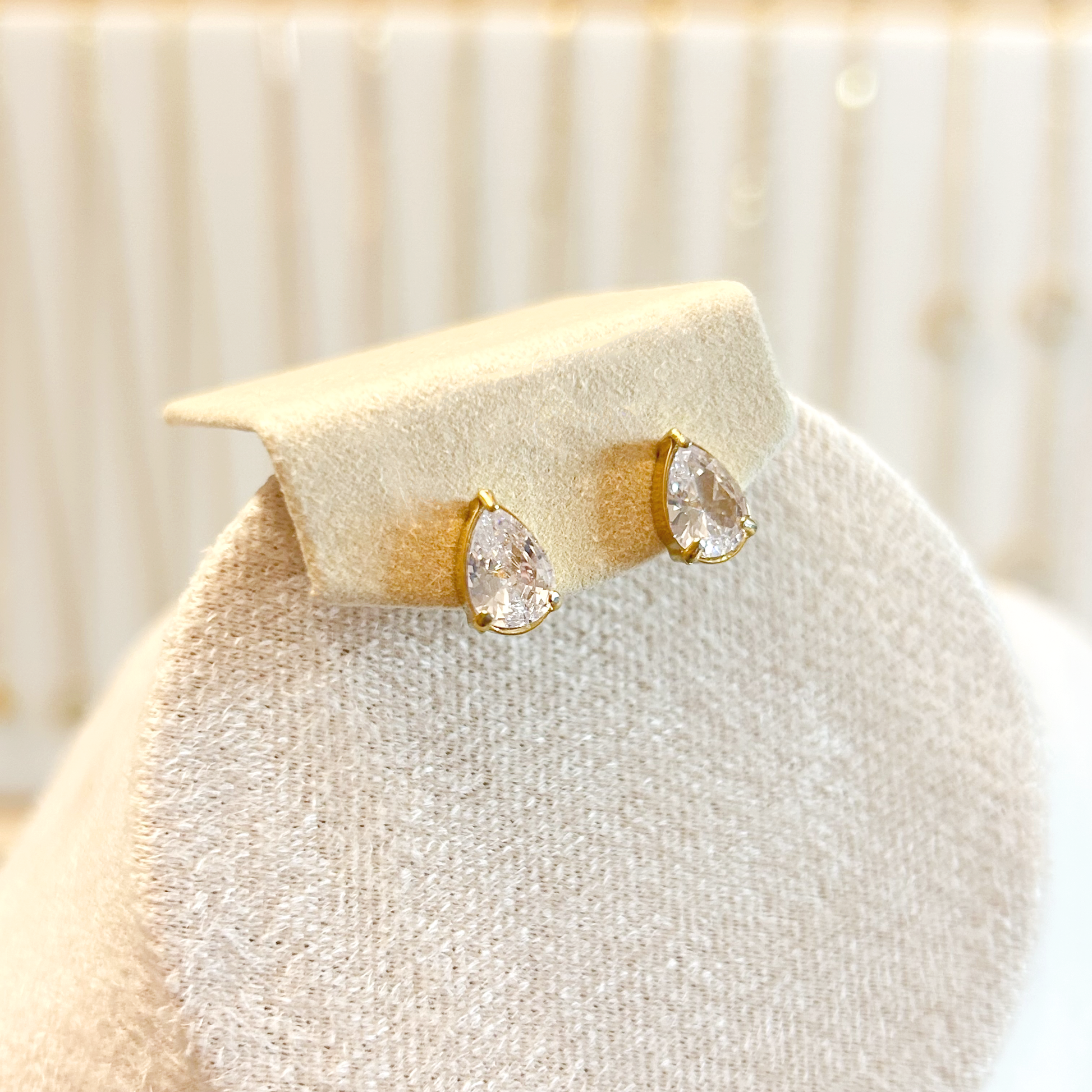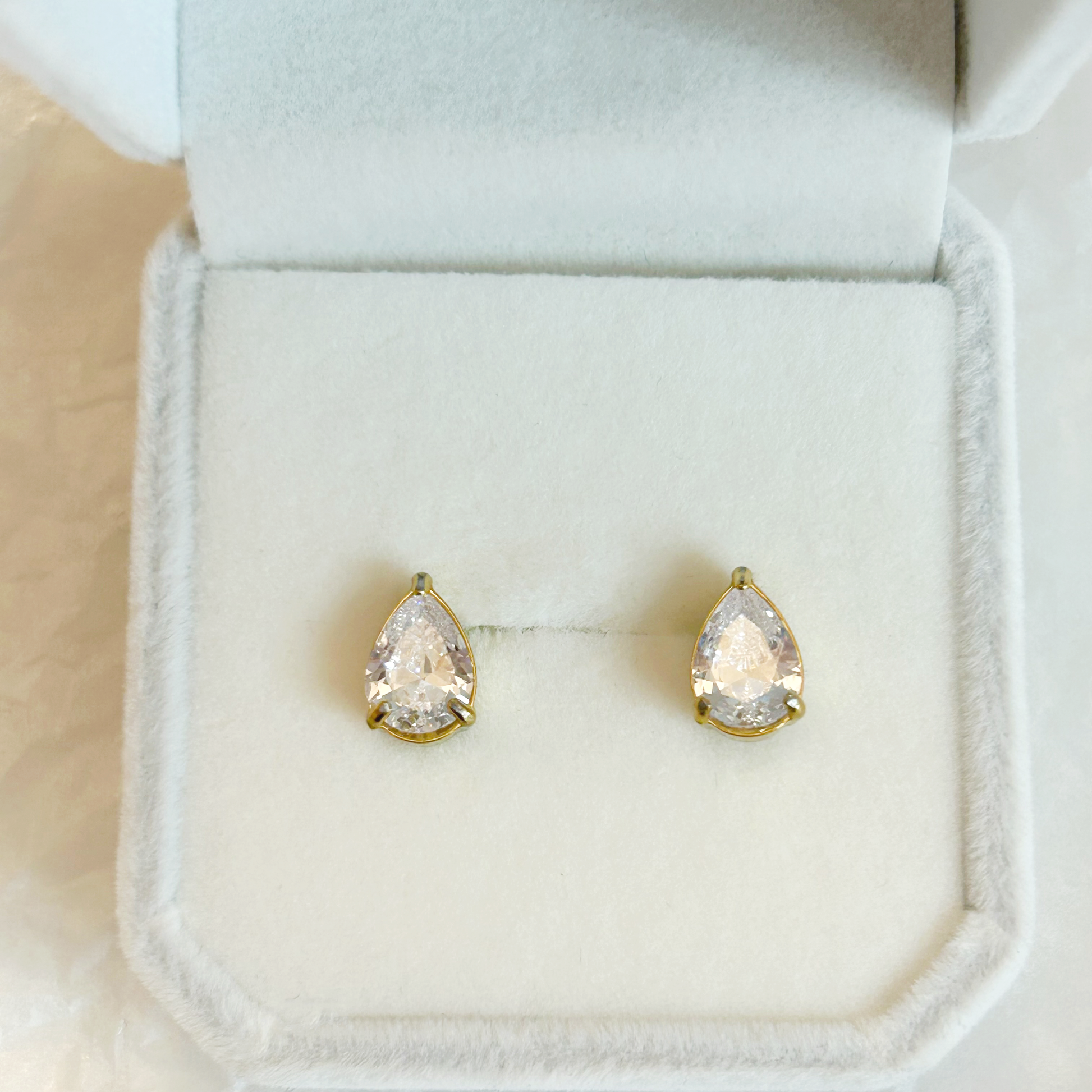 The RADIANT DROP stud earrings in gold are the epitome of pure brilliance. Each individual, teardrop-cut cubic zirconia stone is flawlessly set in 18k gold-plated stainless steel, transforming every light into a vibrant, intense sparkle. Their design deliberately emphasizes reduction and crystalline clarity to create a refined yet understated accent – perfect for everyday wear and special occasions.