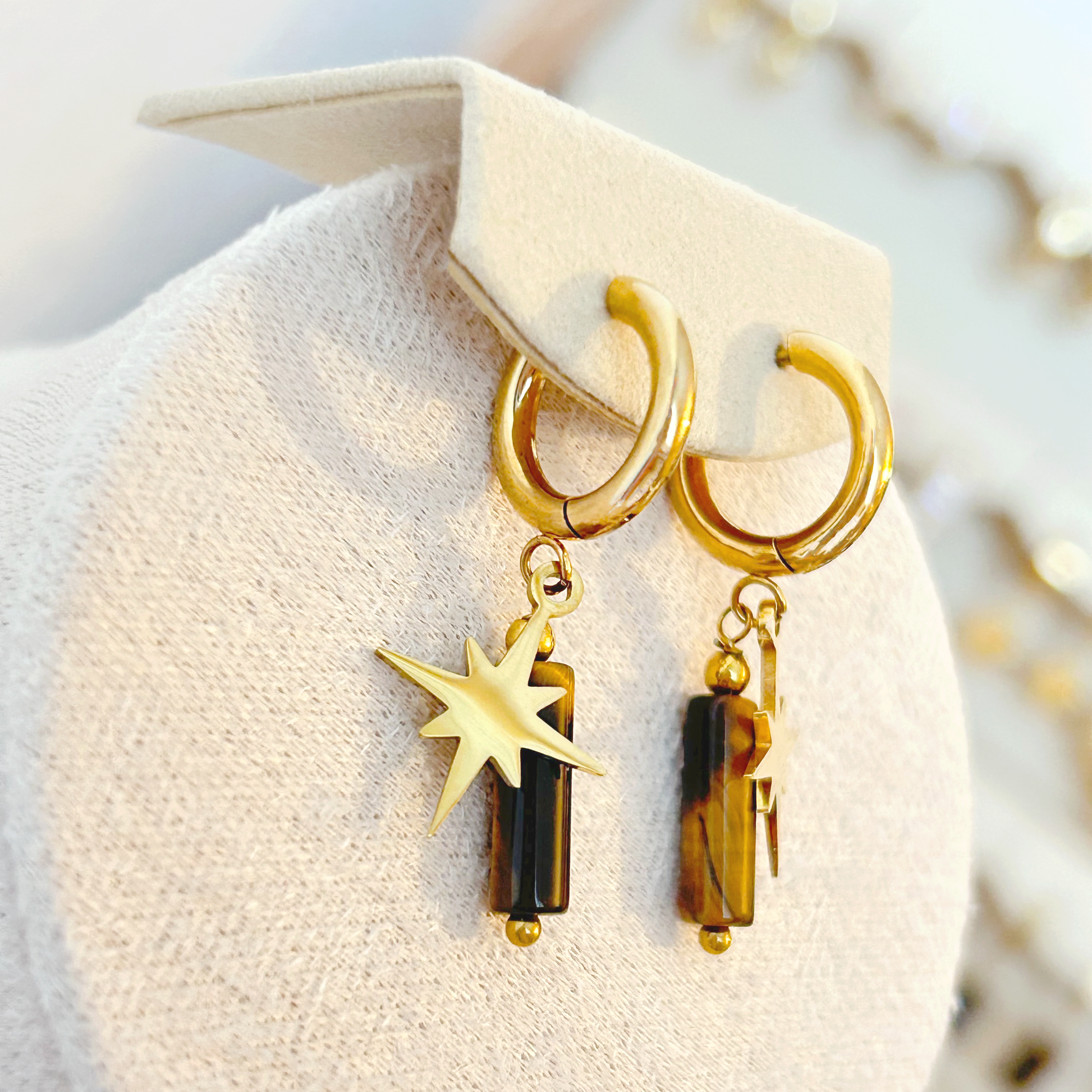 The SPARK earrings in gold combine symbolic radiance with the earthy beauty of tiger's eye. Each hoop features two delicate pendants: a sparkling star motif reminiscent of a spark of light, and a cylindrical natural stone displaying the characteristic, shimmering play of colors typical of tiger's eye. This unique combination lends the earrings a striking elegance – perfect for adding a powerful yet delicate touch to your look.