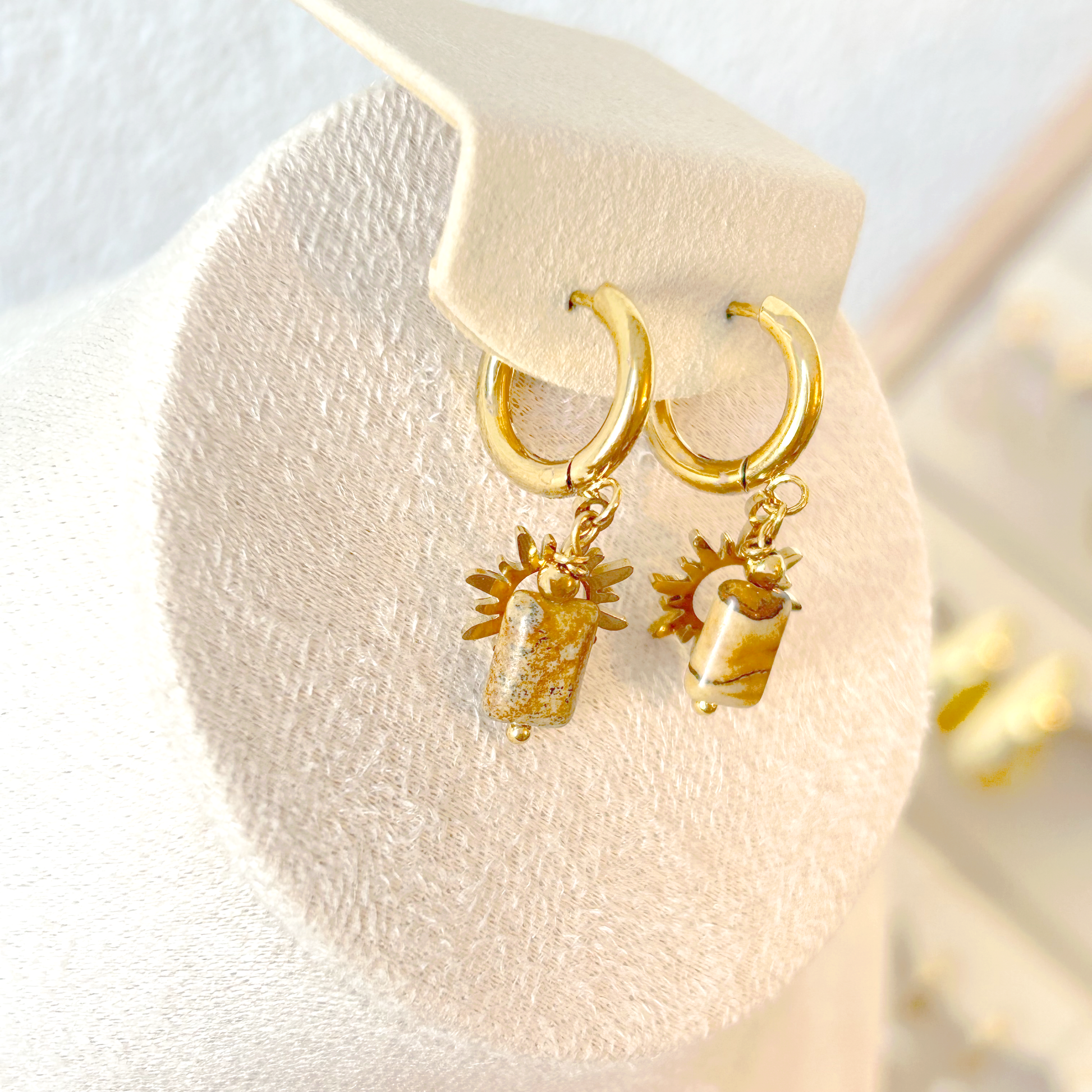 The SUMMER earrings in gold bring sunshine and warmth to your jewelry box. Each small hoop features two intricately detailed charms: a delicately crafted golden sun and a rectangular natural stone in warm brown and beige tones. The fine, natural veining makes each piece unique and lends the earrings a special, earthy elegance. Ideal for sunny days, vacation moments, or adding a touch of summer to your everyday look.