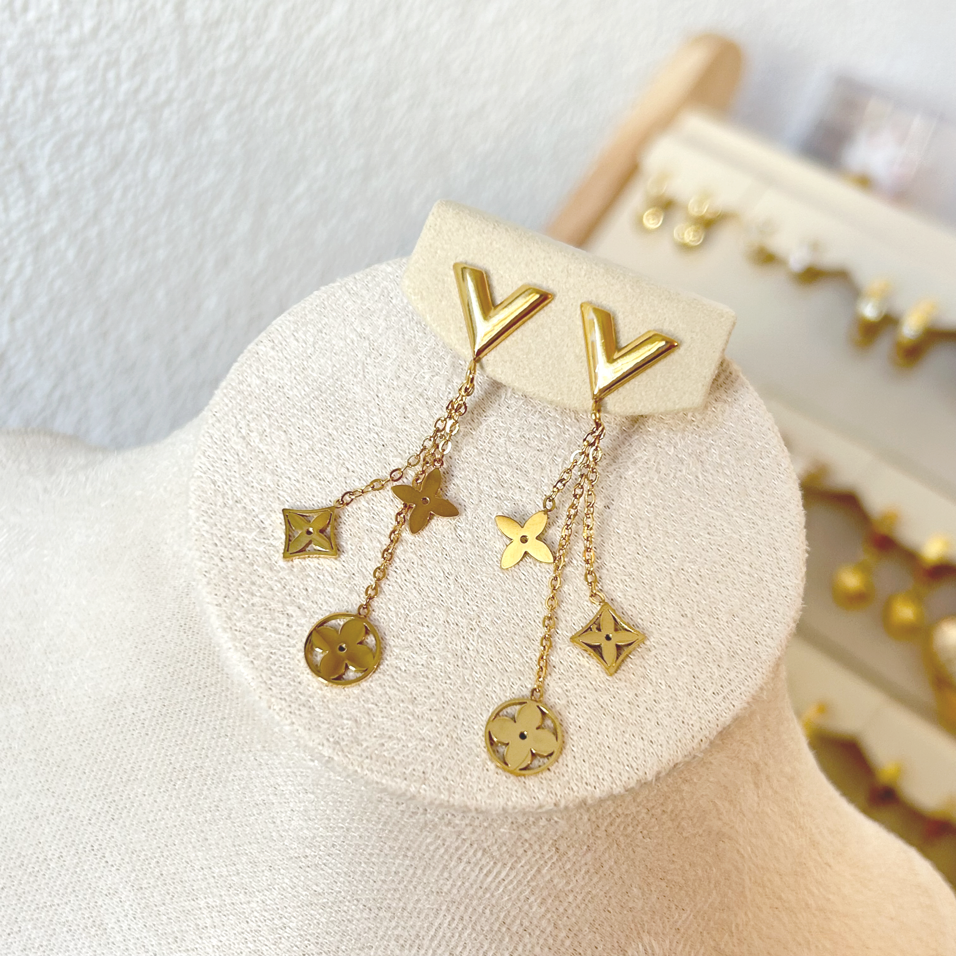 The V DANGLE earrings in gold captivate with their striking V-shaped stud design, from which three delicate chains with stylized flower pendants dangle. The filigree pendants lend the piece a luxurious, feminine touch.