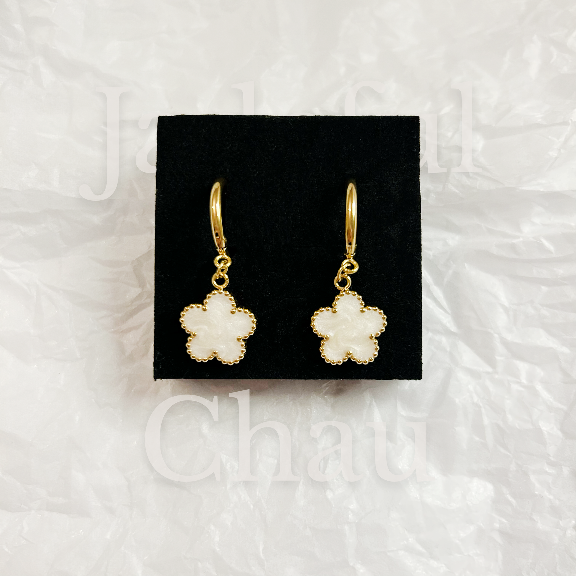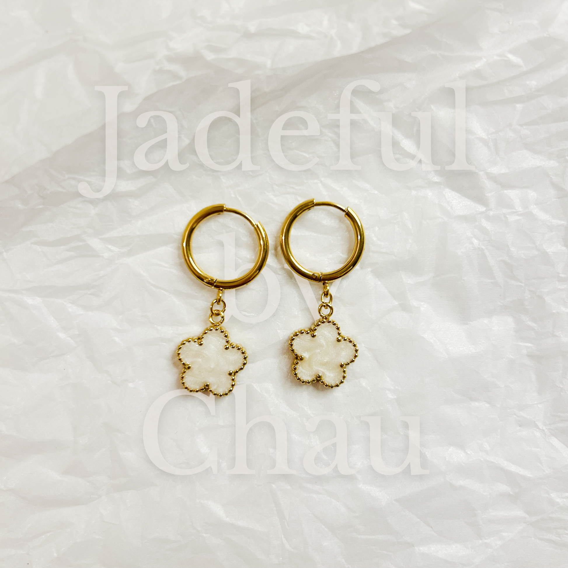 Die BLOOM DANGLE Ohrringe in Weiss vereinen florale Eleganz mit modernem Schwung. Die stilisierten Blütenanhänger aus hochwertigem Resin (Kunstharz) schwingen sanft an zarten Elementen aus 18k vergoldetem Edelstahl und setzen einen stilvollen, femininen Akzent. Wasserfest und rostfrei – ideal für jeden Tag oder besondere Anlässe.