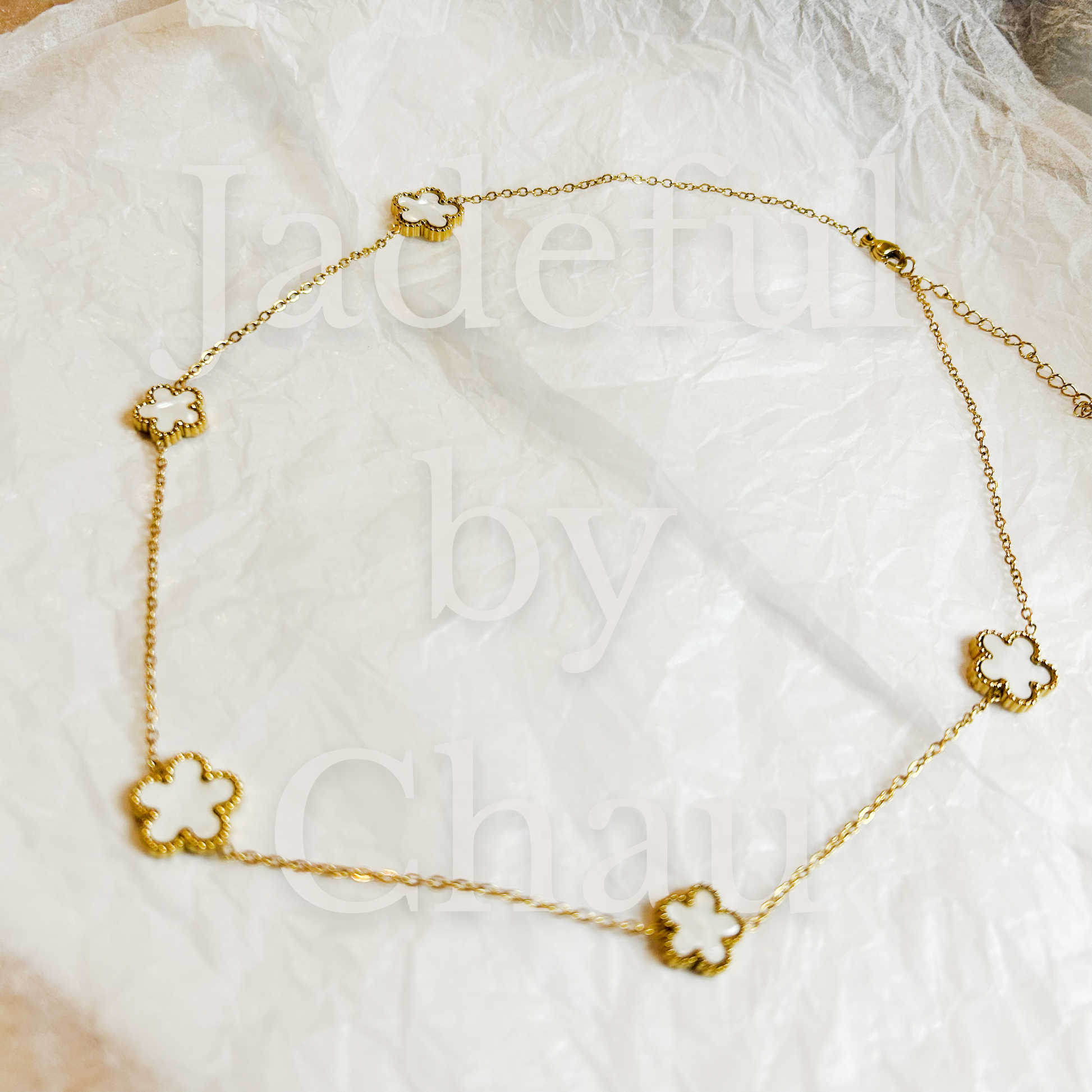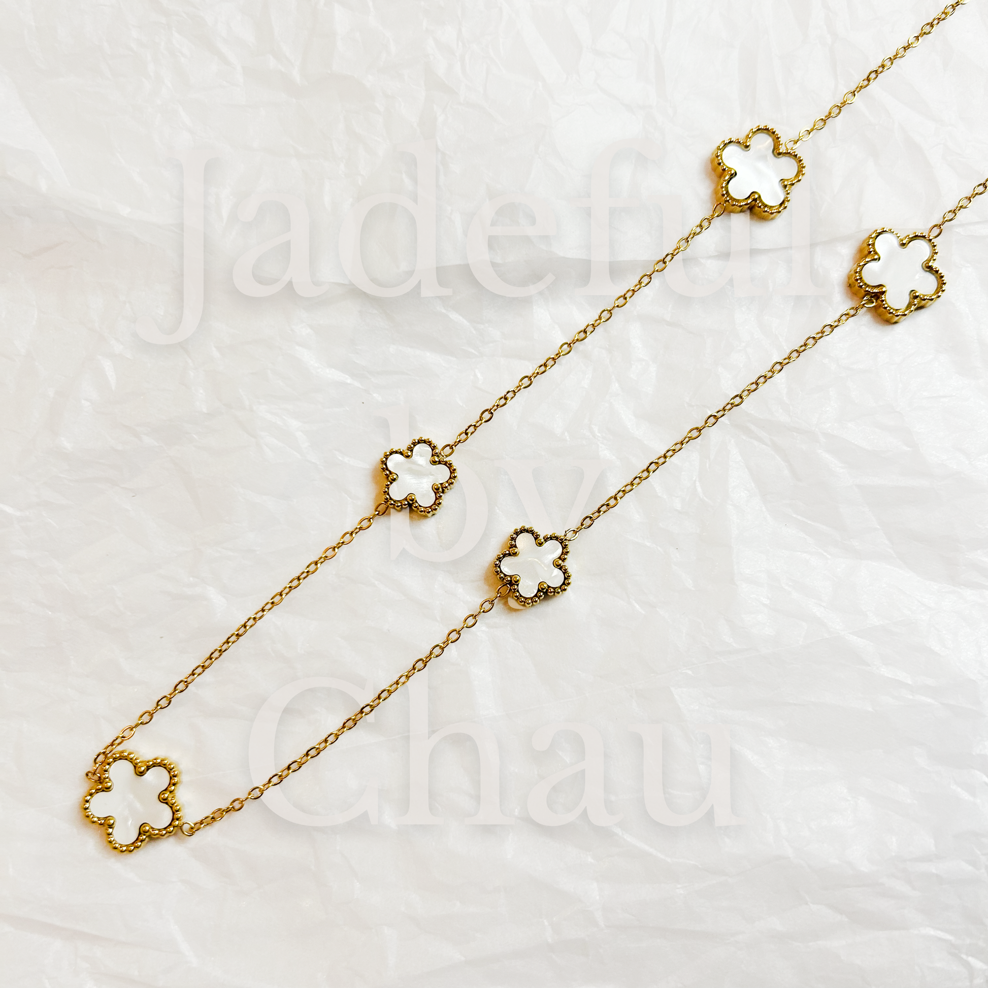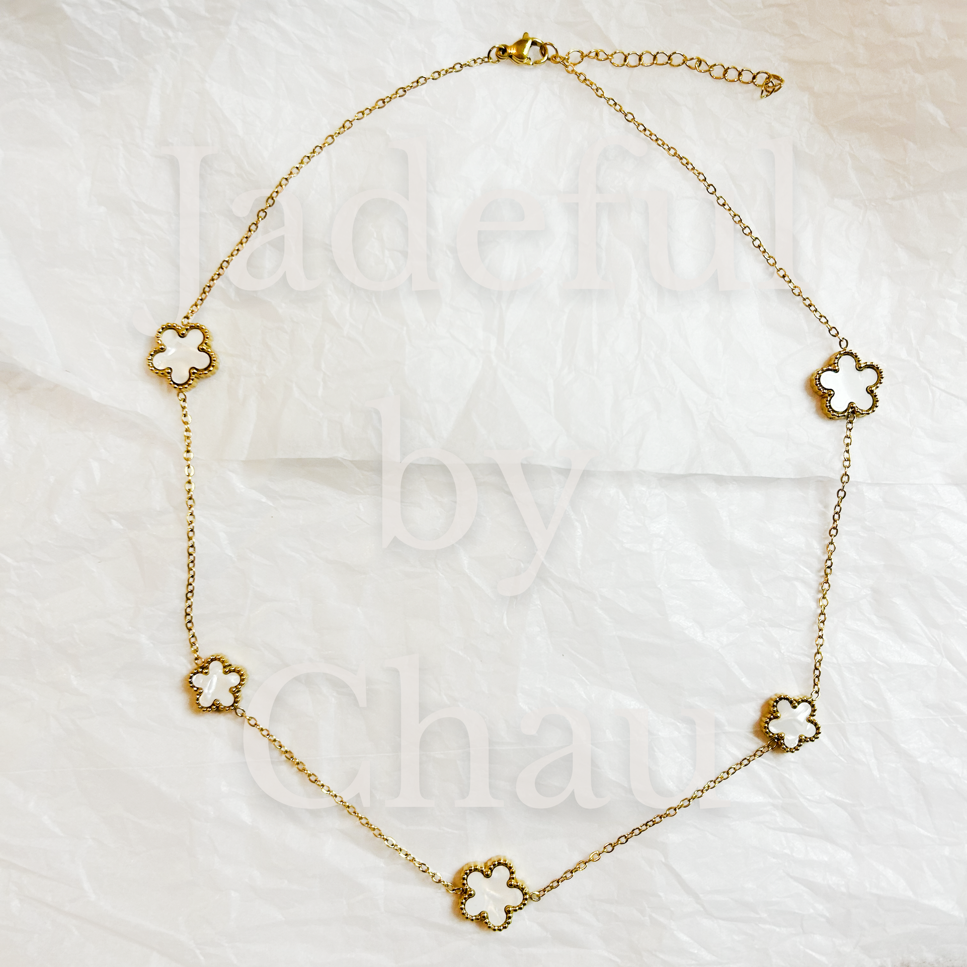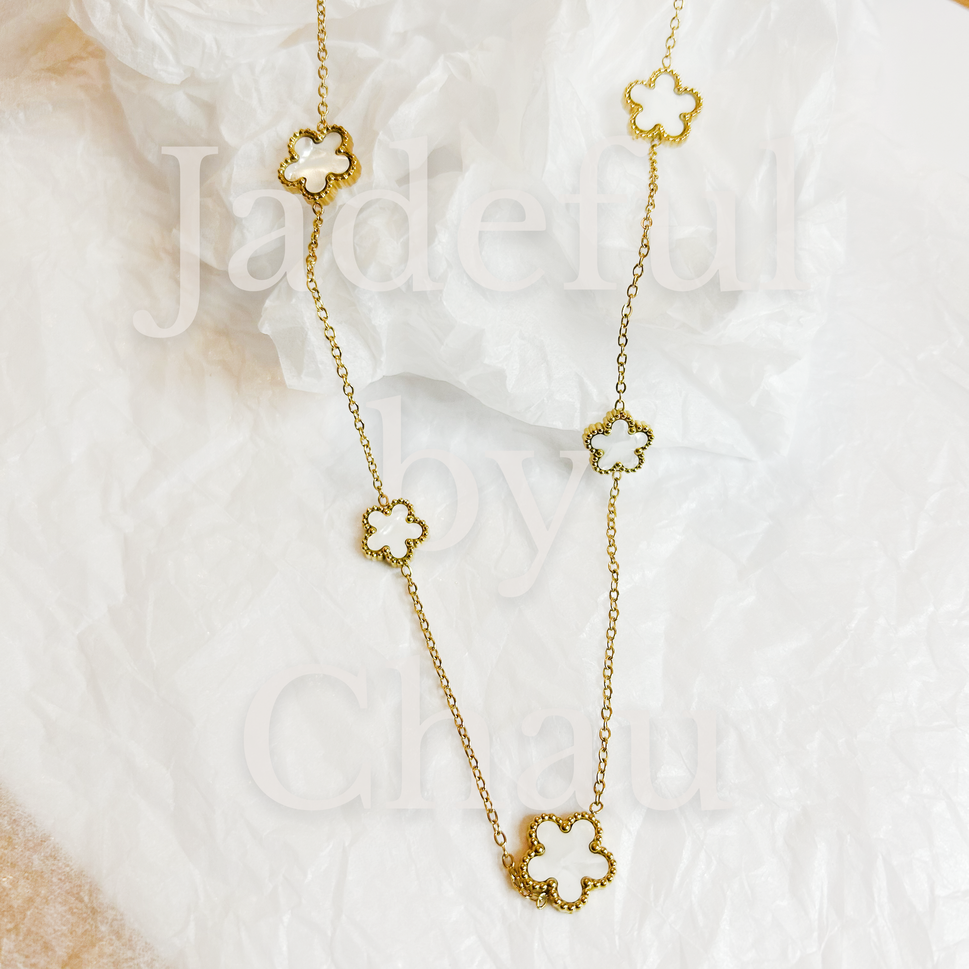 Die BLOOM Halskette in Perlmuttweiss vereint verspielte Leichtigkeit mit femininer Eleganz. Fünf stilisierte Blütenanhänger mit zart schimmernder Faux-Perlmutt-Optik schmücken die 18k vergoldete Edelstahlkette und setzen sanfte, harmonische Akzente. Wasserfest und rostfrei begleitet sie dich stilvoll durch den Alltag – oder verleiht besonderen Momenten das gewisse Etwas.