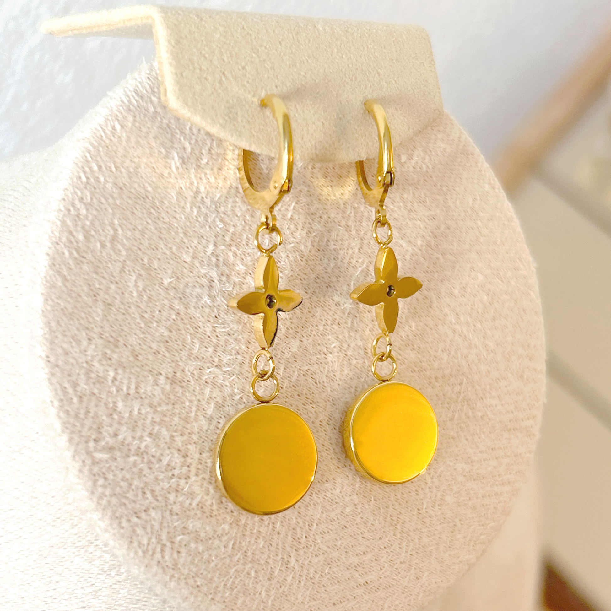 Die FLEUR NACRÉ Ohrringe in Gold sind ein Statement-Stück voller symbolischer Eleganz. Ein fein gearbeiteter, spitzer Blütenanhänger aus 18k vergoldetem Edelstahl krönt das Design. Darunter schwingt ein runder Anhänger, der mit einem zarten Blumenmotiv in Faux-Perlmutt-Optik veredelt ist. Diese Kombination aus metallischem Glanz und weichem, schimmerndem Detail verleiht den Ohrringen einen unverkennbar luxuriösen Charakter.