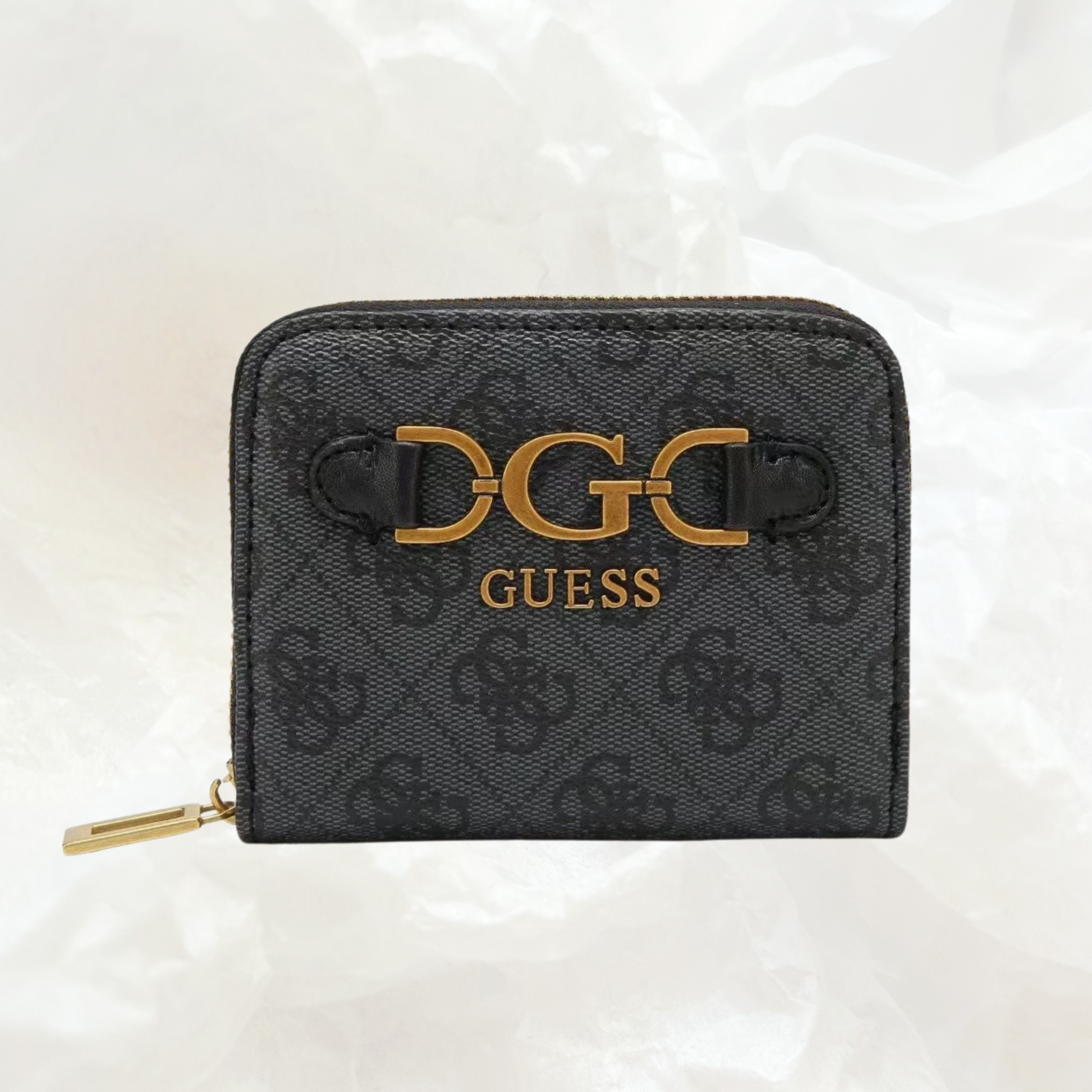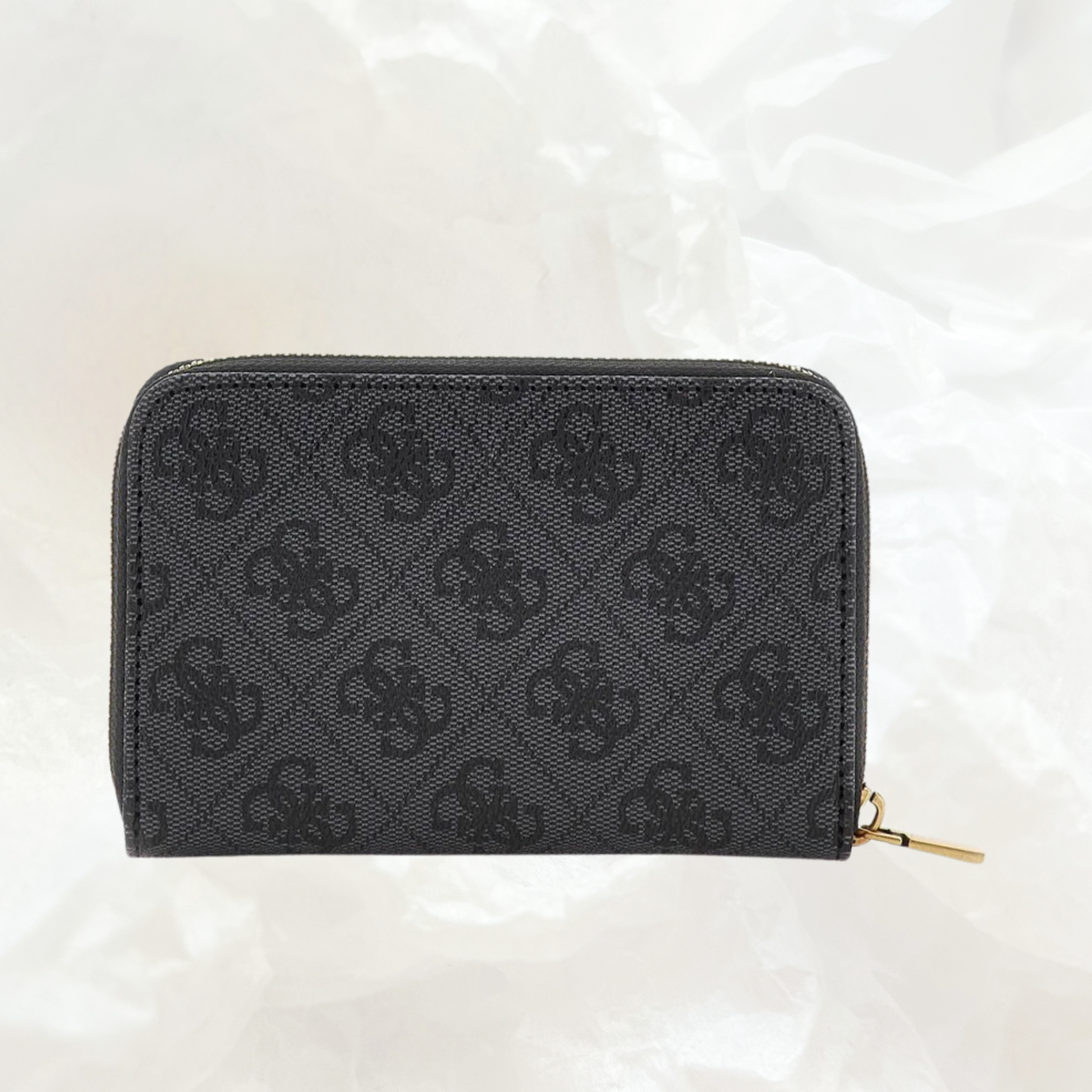 Die GUESS Dagan Portemonnaie Geldbörse SMALL in coal grau überzeugt mit einem stilvollen Zusammenspiel aus grauem Kunstleder und einem dunkelgrauen bis schwarzen 4G Logo Print. Die schwarze Innenseite sorgt für einen eleganten Kontrast, während goldfarbene Metalldetails dem Design eine luxuriöse Note verleihen.