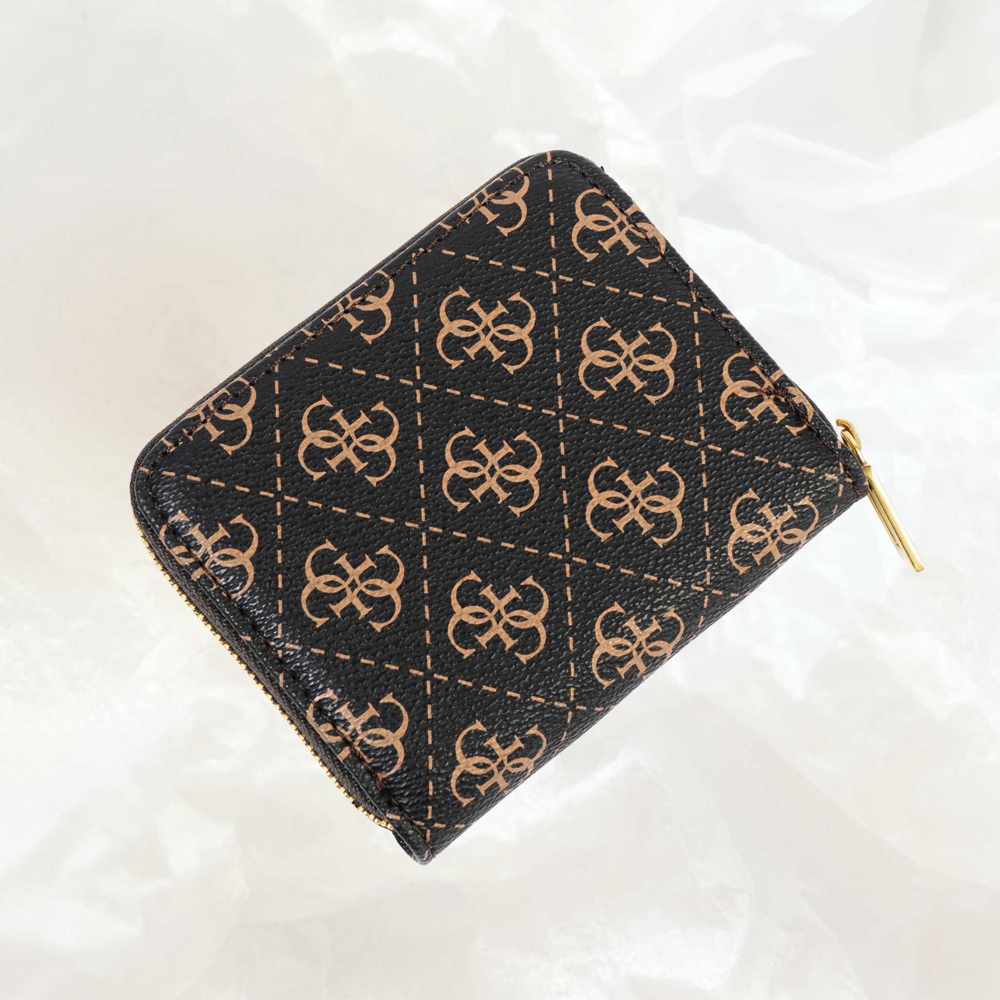 Die GUESS Dagan Portemonnaie Geldbörse SMALL in mocha brown besticht durch ein fast schwarzes, dunkles Braun mit dezentem 4G Logo Print in warmem Mocha-Ton. Die Innenseite ist ebenfalls in Mocha Braun gehalten und sorgt für einen edlen Farbkontrast. Die goldfarbenen Metalldetails verleihen dem Portemonnaie eine luxuriöse Note.