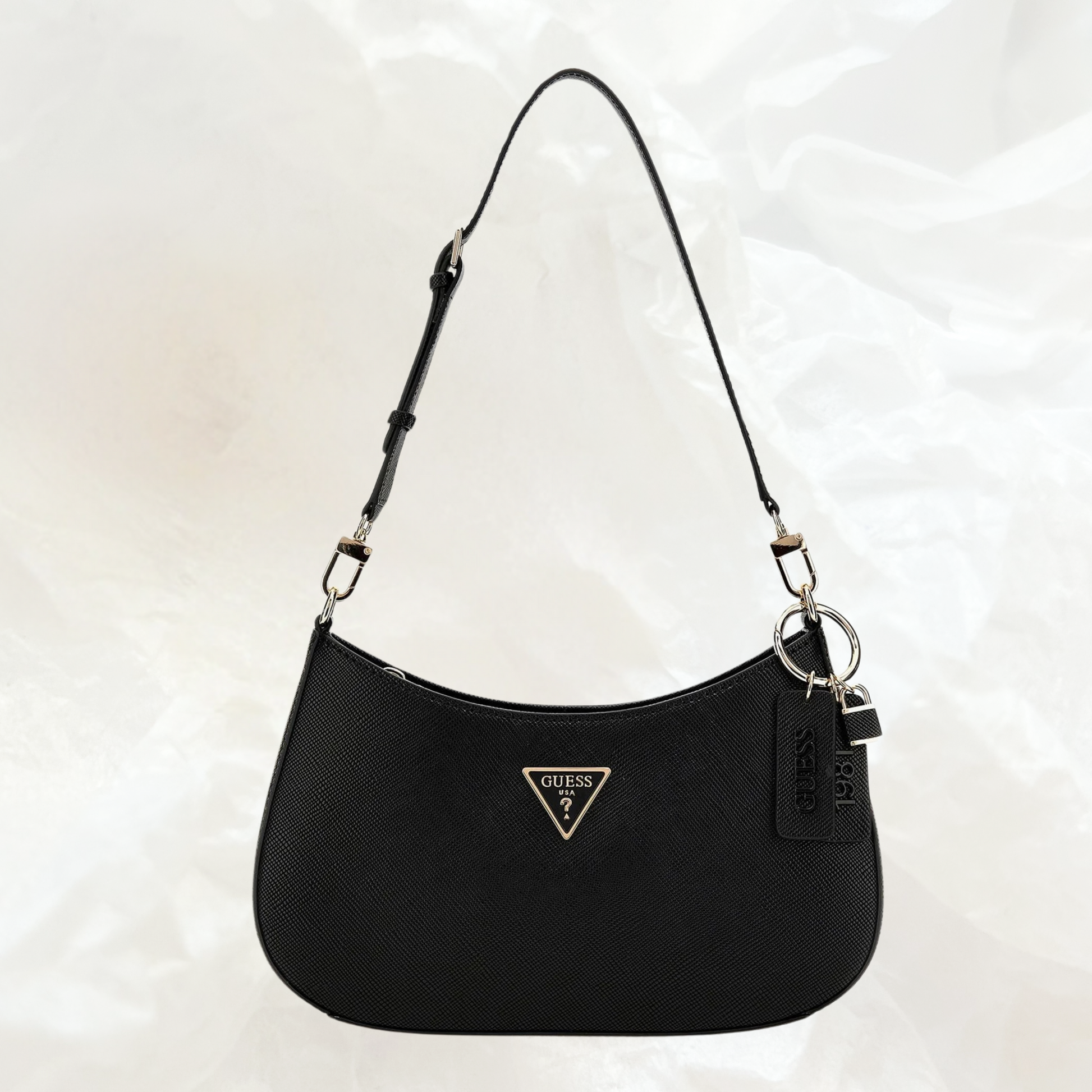 Die GUESS Noelle Top Zip Shoulder Bag in black schwarz überzeugt mit einem cleanen, unifarbenen Look und dezenter Markenästhetik. Das glatte Kunstleder in edlem Schwarz wird durch hellgoldfarbene Metalldetails und das ikonische GUESS-Dreieckslogo auf der Vorderseite stilvoll ergänzt. Ein abnehmbarer Logo-Charm rundet das Design elegant ab.