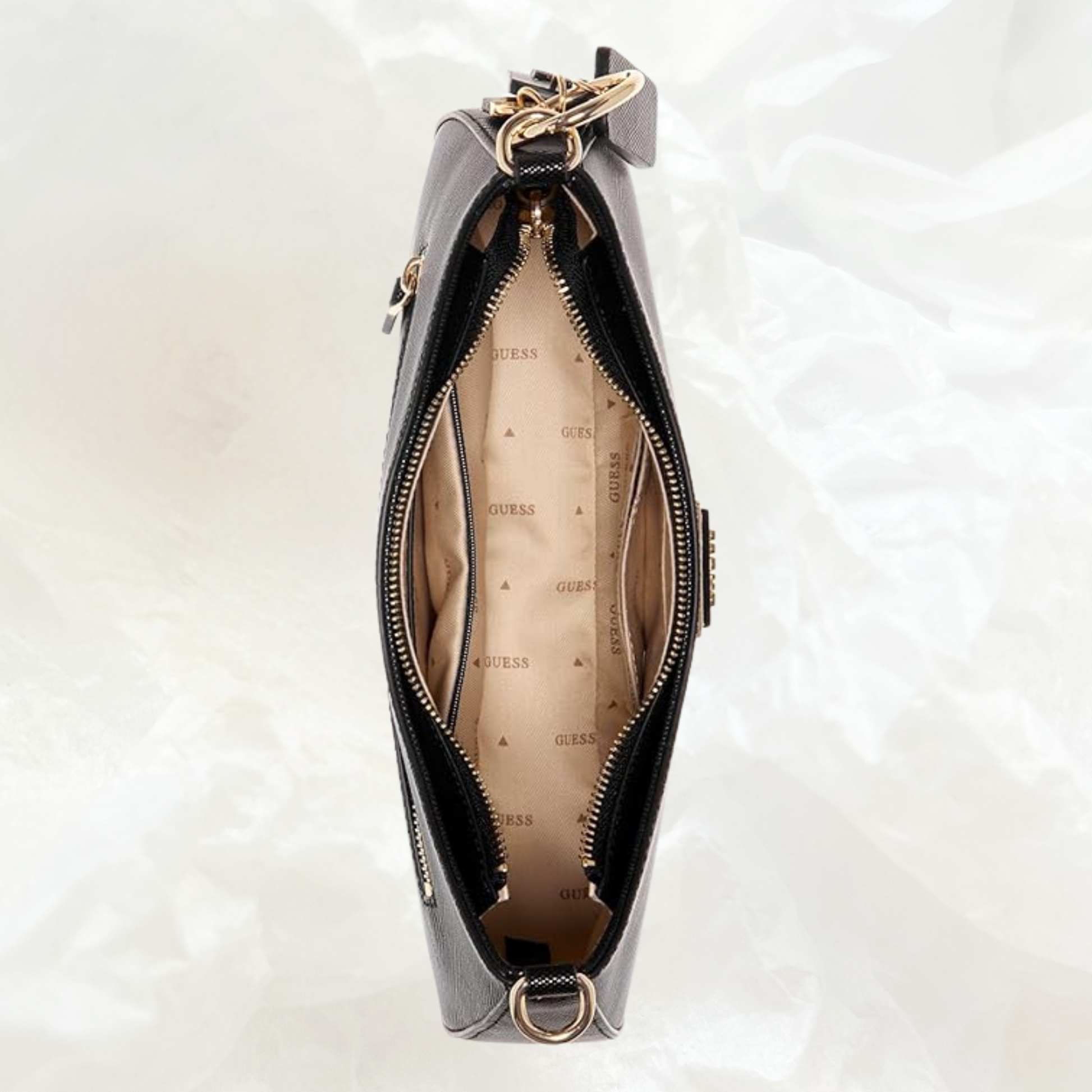 Die Tasche verfügt über einen praktischen Reißverschluss oben und ein zusätzliches Reißverschlussfach auf der Rückseite – perfekt für Dinge, die du schnell griffbereit haben möchtest. Im Inneren sorgt ein Hauptfach mit drei kleinen offenen Fächern sowie einem Reißverschlussfach für Übersicht und Ordnung. Das Innenfutter ist mit dem typischen GUESS-Logo versehen. Dank des verstellbaren Henkels lässt sich die Tasche flexibel über der Schulter tragen und passt sich deinem Look an – ob tagsüber oder abends.
