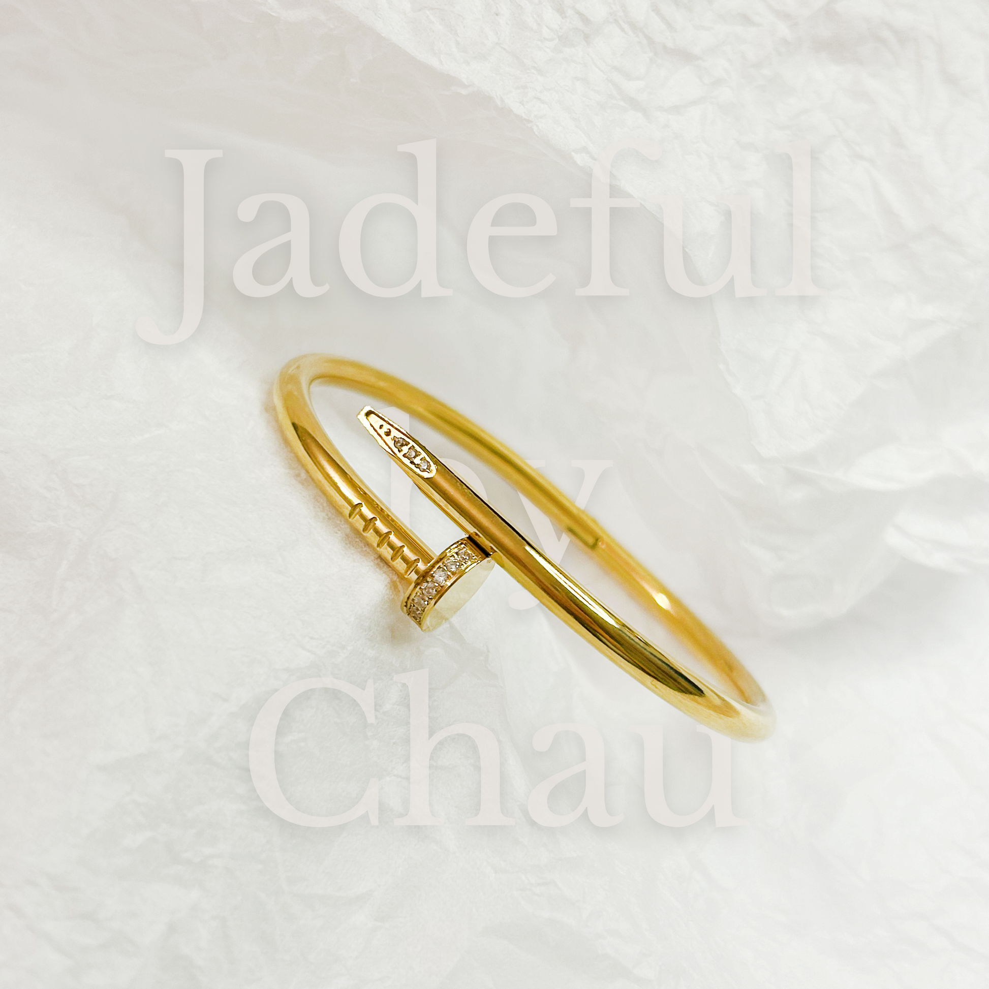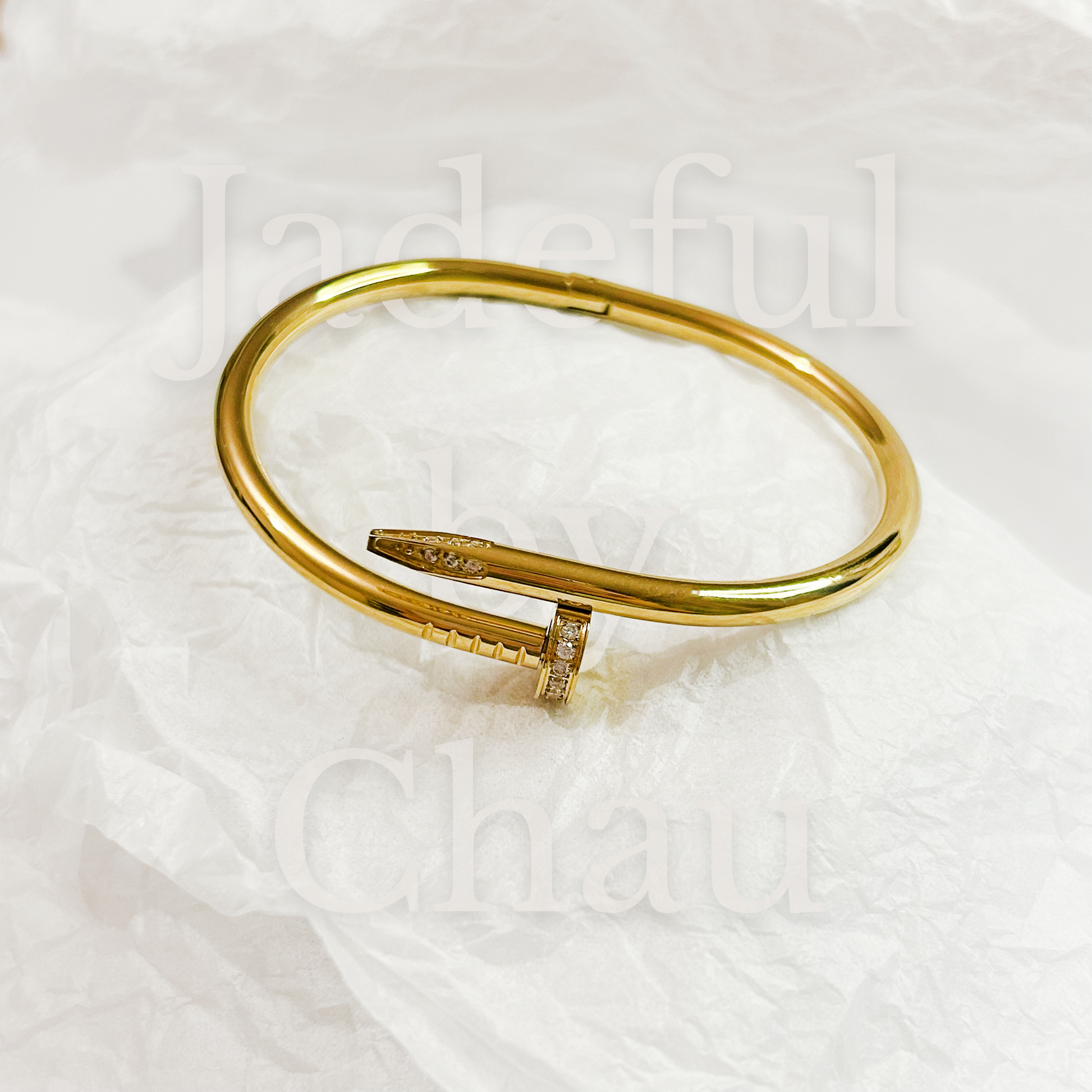 Der JIN CRYSTAL Armreif aus Titan besticht durch sein modernes Nagel-Design, das an den Enden mit funkelnden Zirkonia-Steinen veredelt ist – sowohl an der Spitze als auch am Rand des Nagelkopfs. Die hochwertige 18k PVD-Vergoldung in strahlendem Gold sorgt für einen luxuriösen Glanz. Dieses Accessoire verbindet minimalistischen Stil mit einem Hauch glamouröser Raffinesse und ist sowohl im Alltag als auch zu besonderen Anlässen ein echter Hingucker.