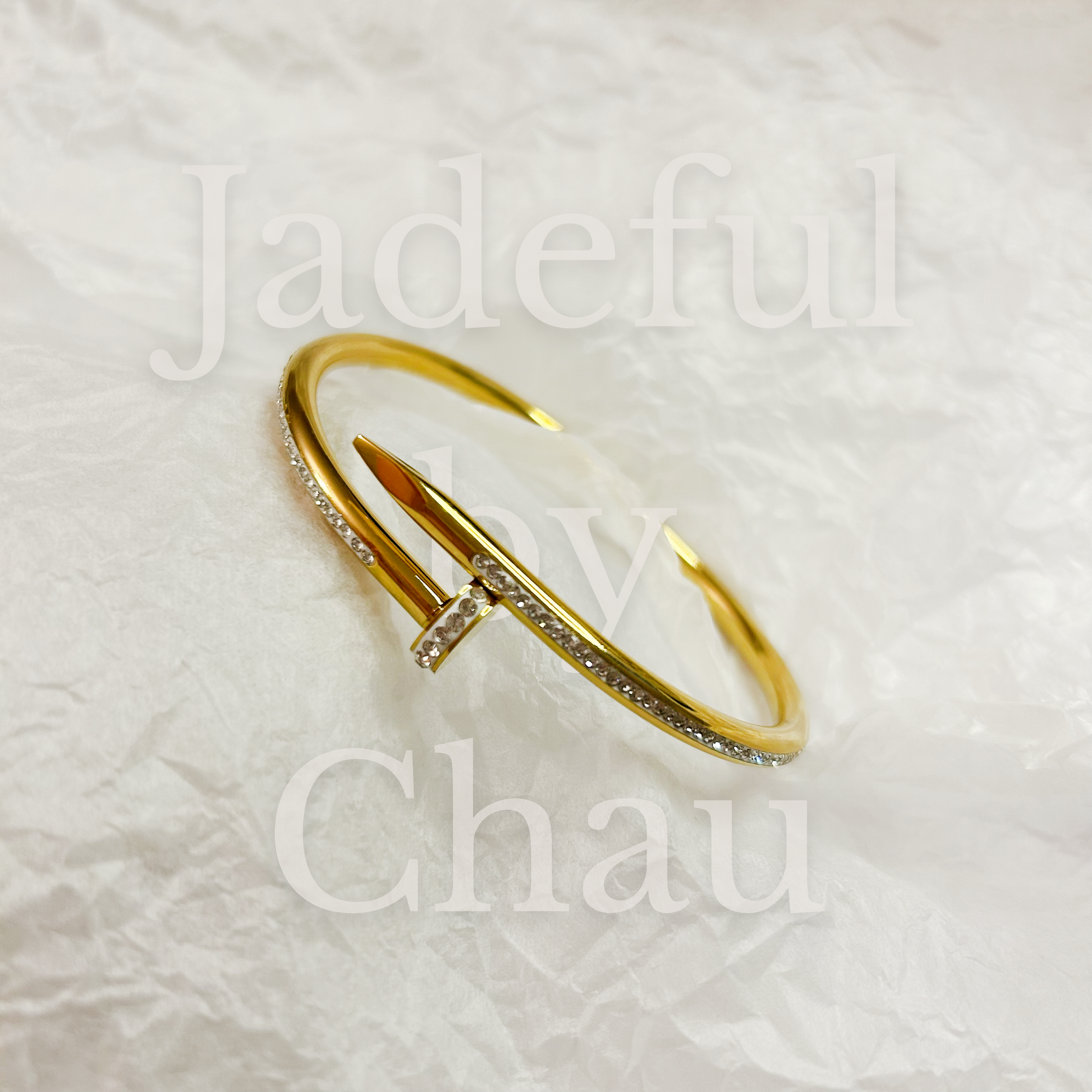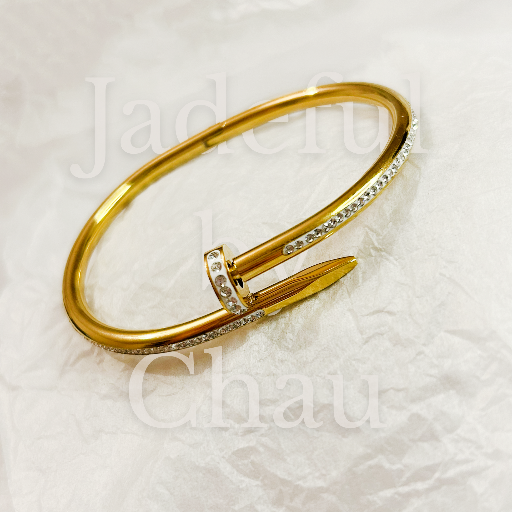 Der JIN FULL CRYSTAL Armreif aus Titan begeistert mit seinem markanten Nagel-Design, das vollständig von funkelnden Zirkonia-Steinen umrahmt wird. Die hochwertige 18k PVD-Vergoldung in strahlendem Gold verleiht dem Schmuckstück einen luxuriösen Glanz und macht es zum perfekten Accessoire für besondere Anlässe und stilbewusste Auftritte. Dieses ausdrucksstarke Schmuckstück verbindet opulentes Funkeln mit moderner Eleganz und setzt ein kraftvolles Statement.