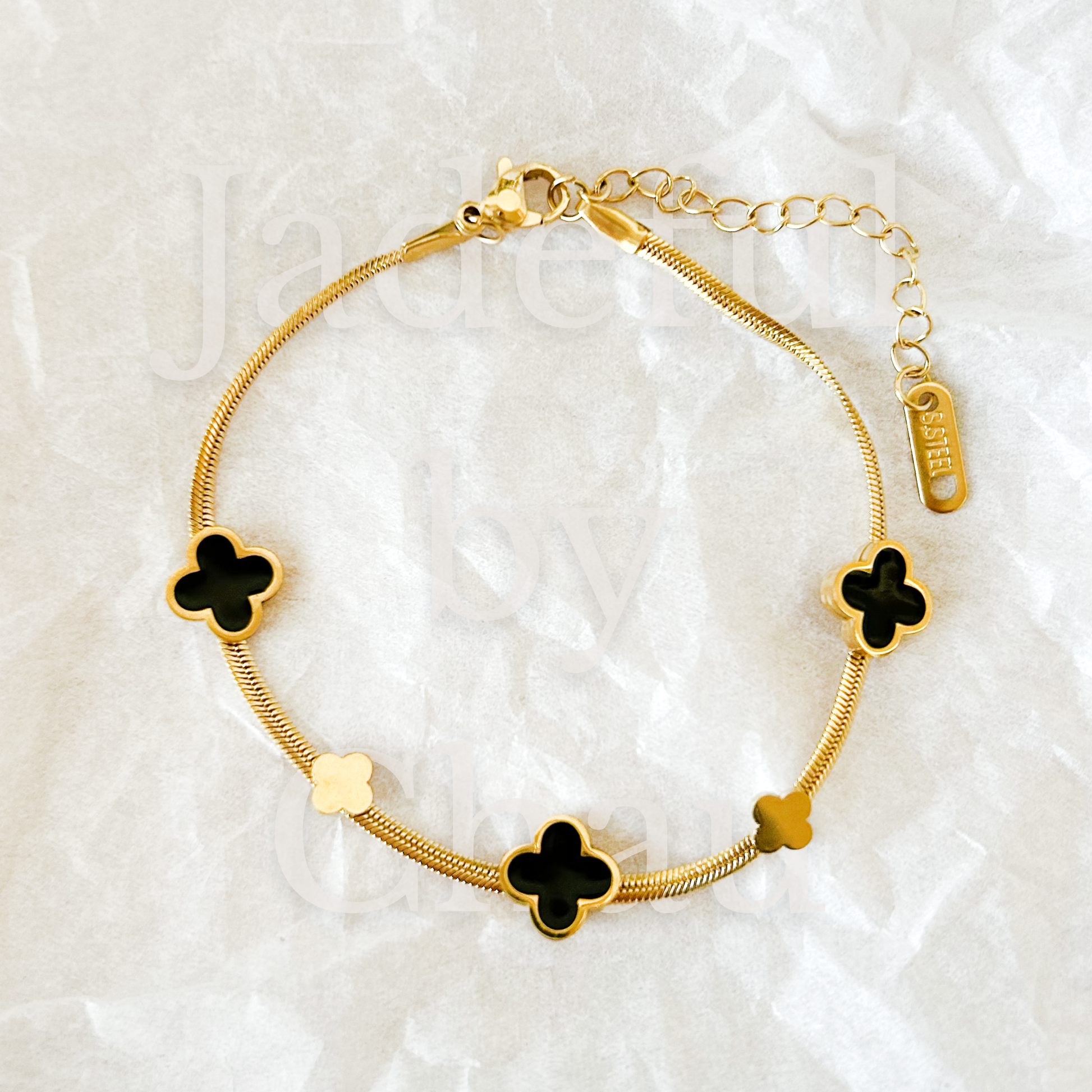 Das MILANO Armband in Gold kombiniert klare Linien mit charmanten Akzenten. Drei tiefschwarze Elemente bilden den eleganten Kontrast zu zwei goldenen Kleeblatt-Details – stilvoll angeordnet entlang der feinen Armkette. Die harmonische Farb- und Formkombination verleiht dem Design eine moderne Leichtigkeit mit einem Hauch von Glückssymbolik. Gefertigt aus robustem Edelstahl mit 18k Vergoldung ist das Armband wasserfest, rostfrei und der perfekte Begleiter – ob im Alltag oder zu besonderen Anlässen.