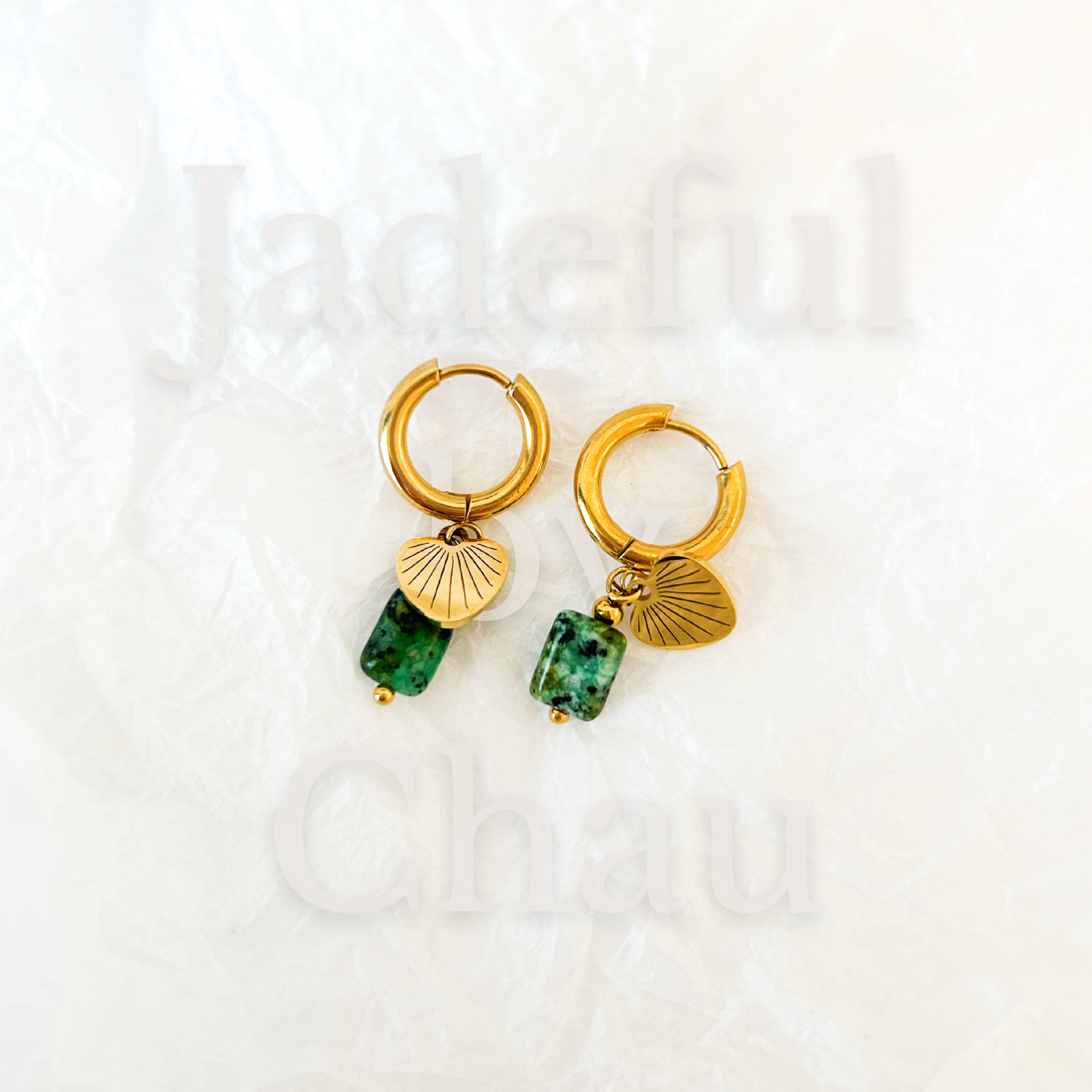 Die NATURE Ohrringe in Gold vereinen filigranes Design mit einem Hauch wilder Eleganz. Jeder kleine Hoop ist mit zwei feinen Anhängern verziert: einem zarten Blatt in Gold und einem rechteckigen Naturstein. Der verwendete afrikanische Türkis – ein Jaspis mit charakteristischer grünlicher Farbe und dunklen, marmorartigen Einschlüsse – verleiht dem Look eine organische Tiefe. Die asymmetrische Kombination macht die Ohrringe zu einem besonderen Blickfang – perfekt für alle, die Natürlichkeit mit Stil tragen wollen.