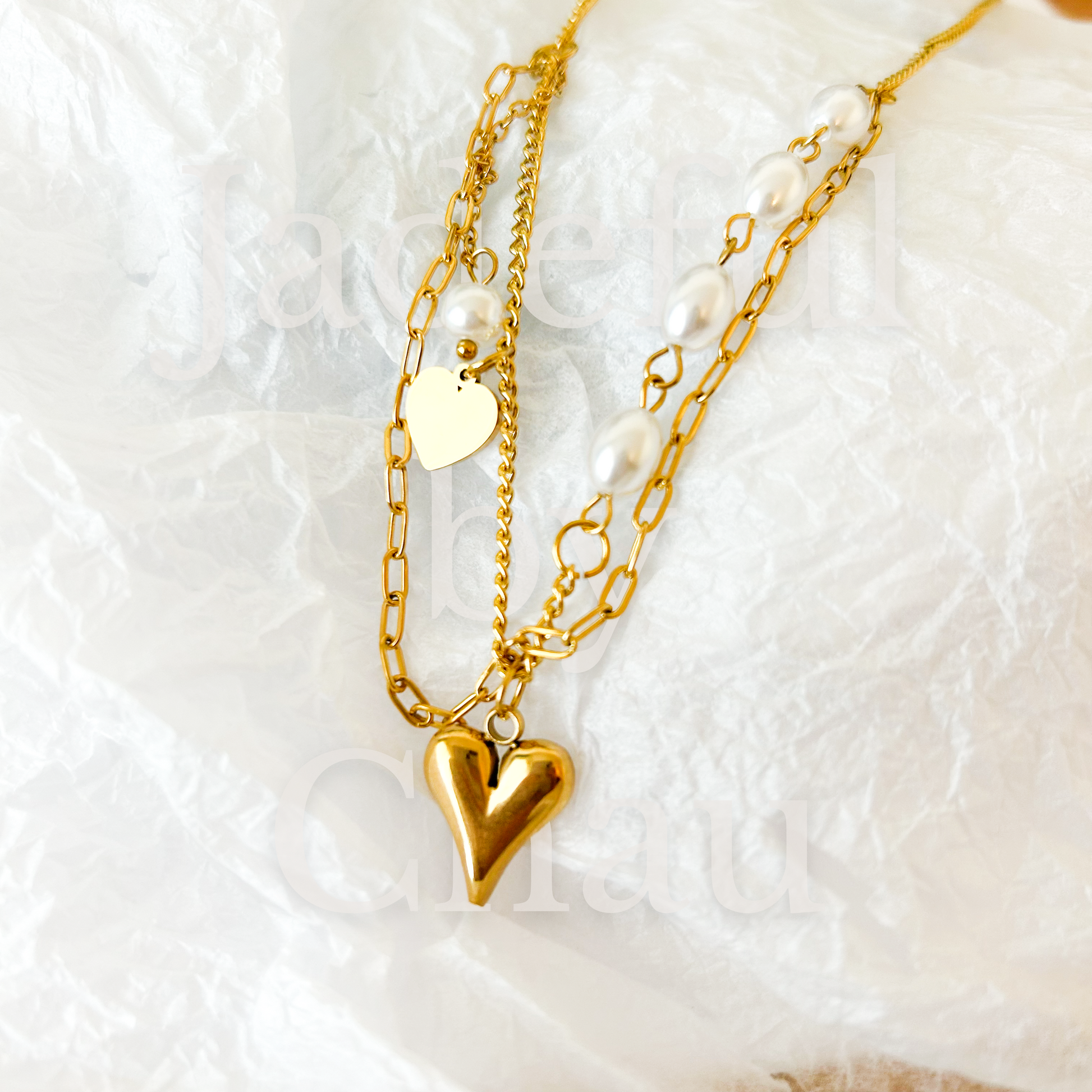Die PEARL LOVE Halskette in Gold verbindet einen grossen Herzanhänger mit zarten, ovalen Faux-Perlen auf einer Seite der Kette. Auf der anderen Seite sorgt ein kleines, baumelndes Herz zusammen mit einer runden Faux-Perle an feinen Kettchen für verspielte Leichtigkeit. Die geschickt verlaufenden Kettenlinien schaffen einen harmonischen Look, der deinen Stil auf elegante Weise unterstreicht.