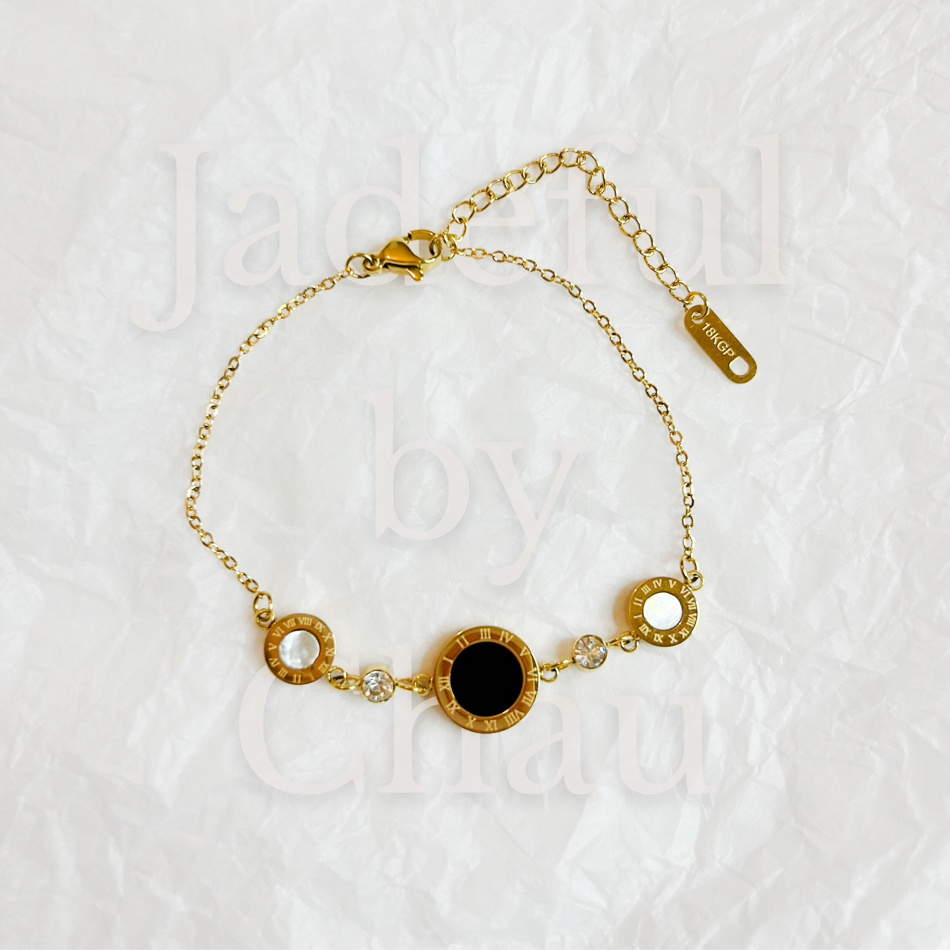 Die ROMA Armkette in Gold besticht durch ihr markantes Design mit fünf festen Anhängern, die perfekt harmonieren. Zwei runde Anhänger in Perlmuttweiss sind von filigranen römischen Zahlen umgeben, während zwei kleine runde Zirkonia-Steine dezenten Glanz hinzufügen. Im Zentrum zieht ein größerer, schwarzer runder Anhänger mit ebenfalls eingravierten römischen Zahlen alle Blicke auf sich. Gefertigt aus hochwertigem 18k vergoldetem Edelstahl vereint diese Armkette zeitlose Eleganz mit einem Hauch von Geschichte – ideal für besondere Momente und den Alltag.