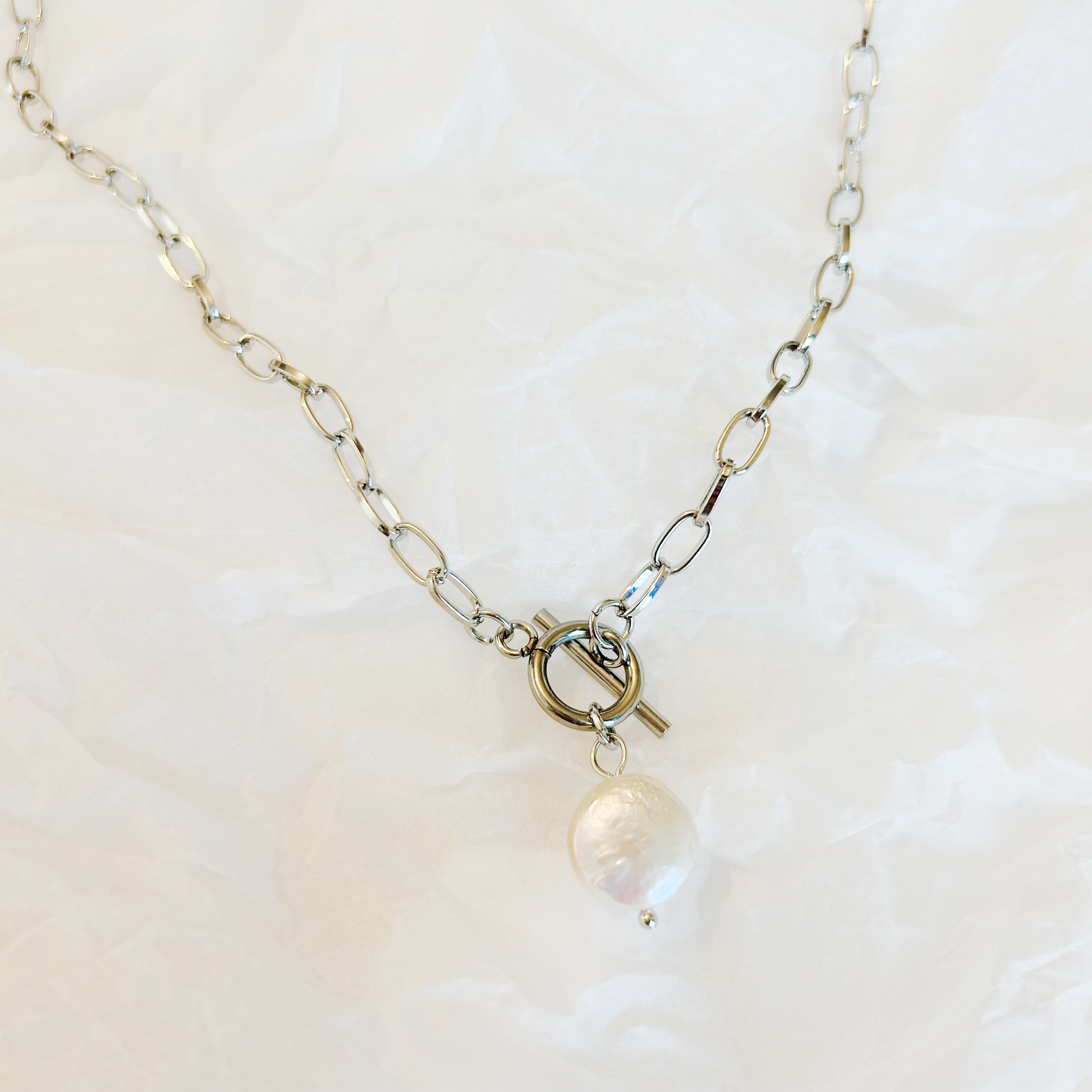 Die SINGLE PEARL Halskette – Silber beeindruckt durch ihr minimalistisches Design und den markanten Matrosen-Verschluss. Der runde, flache Perlenanhänger setzt einen eleganten Akzent, während der Verschluss aus einem großen Ring und einem Stab das Schmuckstück mit einem modernen maritimen Flair abrundet. Gefertigt aus hochwertigem Edelstahl, verbindet diese Kette klassische Schönheit mit zeitgemäßem Stil – perfekt für jeden Anlass. Erhältlich ist die Halskette auch in einer goldenen Variante aus 18k vergoldetem Edelstahl.