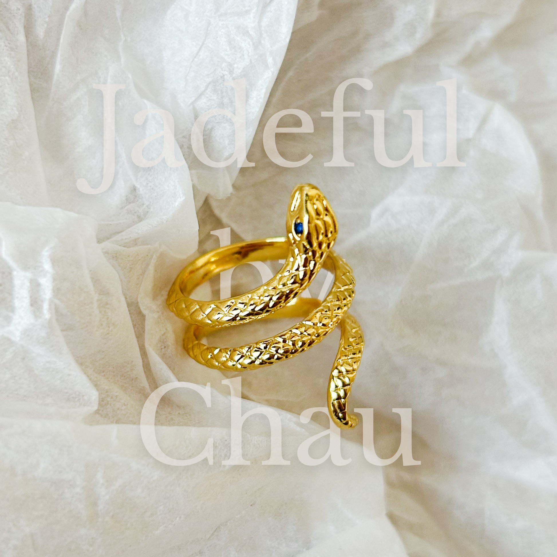 Der SNAKE Ring in Gold zieht mit seinem geschwungenen Schlangen-Design und funkelnden Details alle Blicke auf sich. Gefertigt aus robustem Edelstahl und veredelt mit einer hochwertigen 18k Vergoldung, schmiegt sich der grössenverstellbare Ring elegant um den Finger. Zwei leuchtend blaue Zirkonia-Steine bilden die Augen der Schlange und verleihen dem Design eine geheimnisvolle, kraftvolle Ausstrahlung – ideal für ausdrucksstarke Looks mit Persönlichkeit.